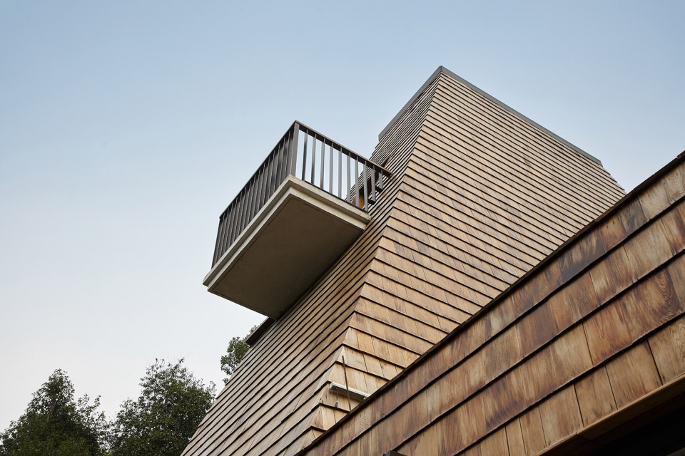 建筑风格呈现出一种对比的状态,一层采用传统手艺的水泥石灰参杂一定稻草,朴实而厚重,成为茶园的背景。二楼采用木饰面,与一层形成反差,漂浮在空中。不同坡度的略显随意的四坡顶形成变化的天际线与背后的一排松树交相呼应。场地中间的一颗大树仿佛从建筑中生长出来,这些都回应了场地特征:保护生态,植根于茶园,与松树互映。