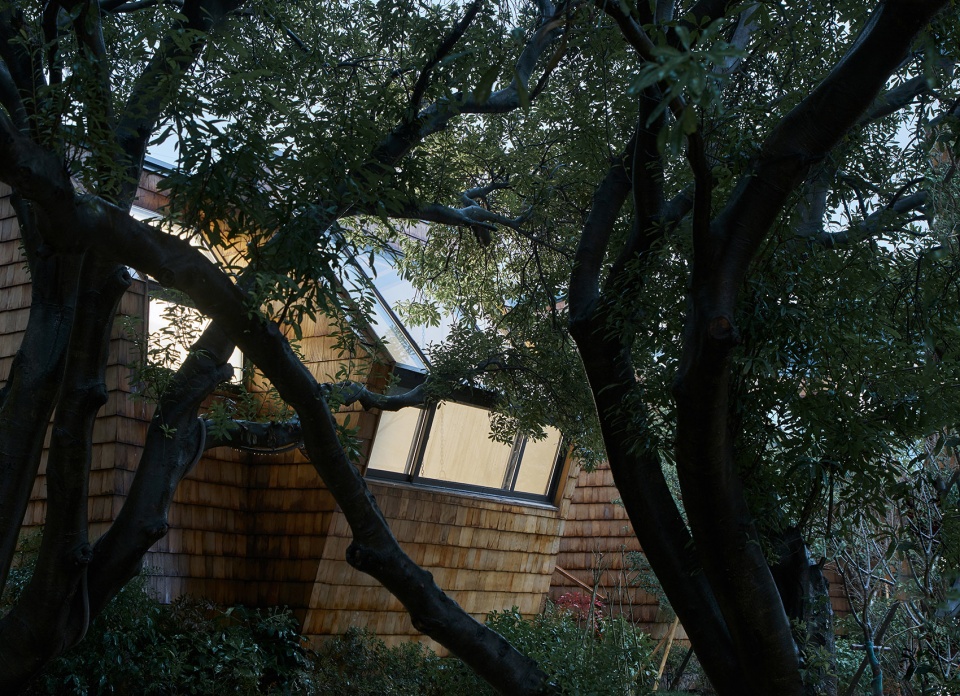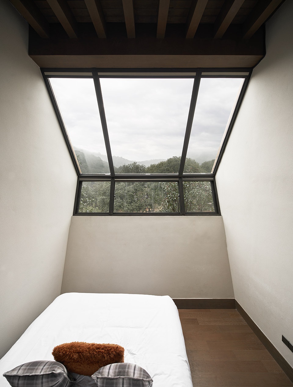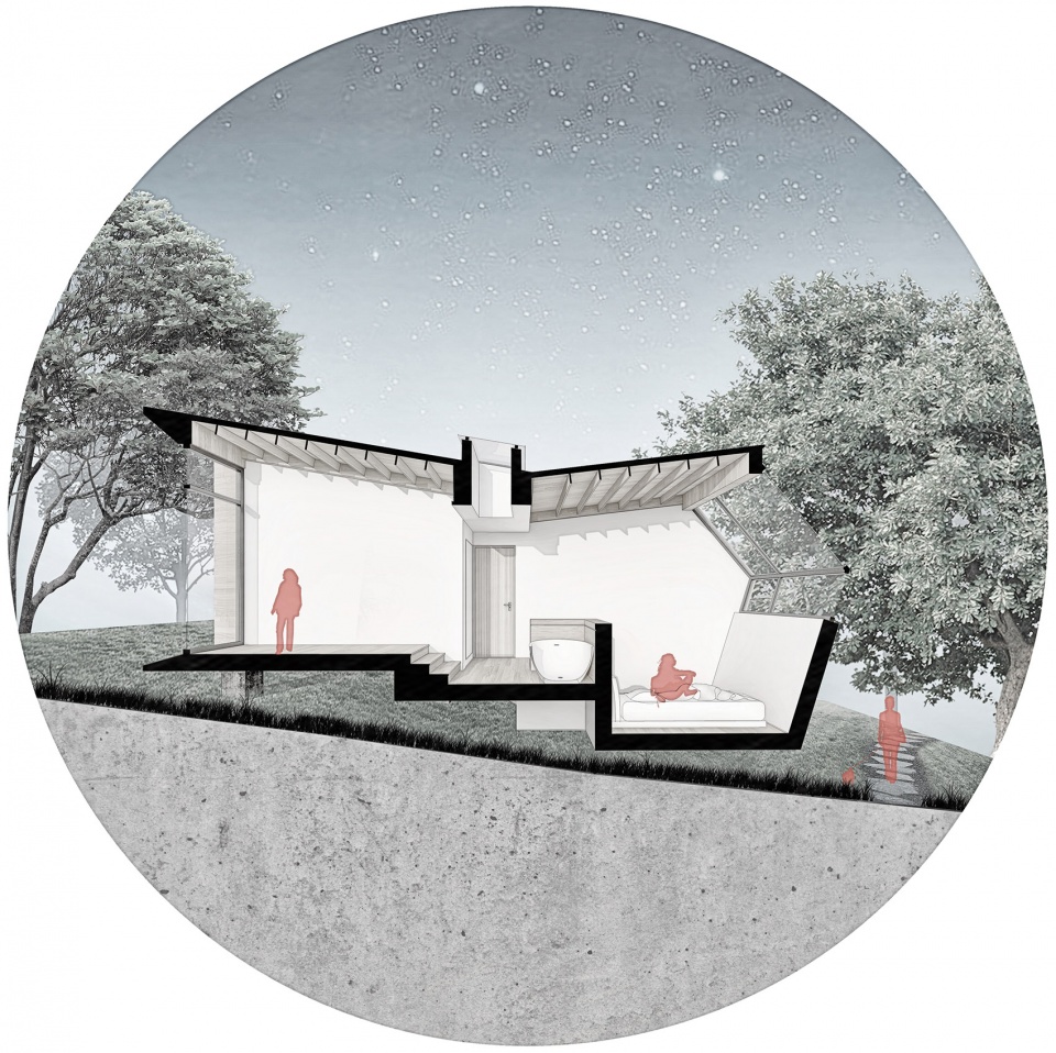 顺应缓坡的地形,室内空间依次被划分成3个不同的标高,不同标高之间用错位的台阶联系。入口玄关为中点标高,并设置天窗,给予一定的引导。客厅位居高点标高,通过大面积的落地玻璃窗,联系室外庭院。低点标高便是卧室,希望躺在这里的人可以自在的透过窗户仰望星空,所以设计了一扇既不平行也不垂直的转折窗户,这扇窗户即满足了建筑采光通风观景的需求,也完成了建筑本身的神态注入。