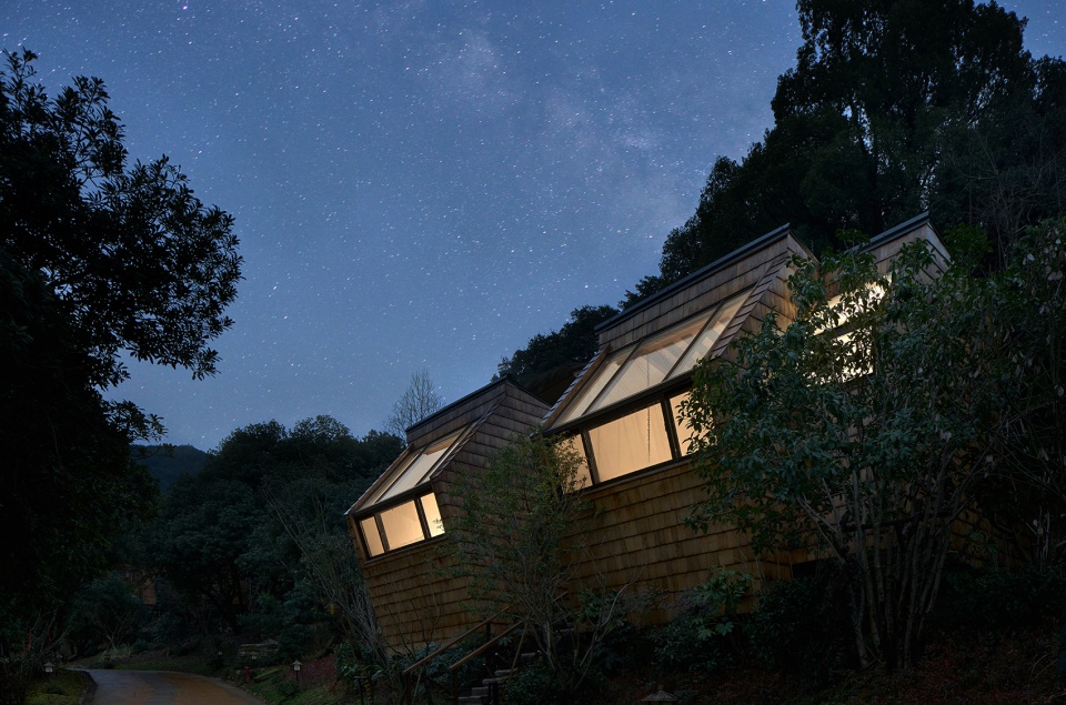 The site characteristics arouse a lot of inspirations for creation. As a natural barrier, the dense bayberry trees hide the site buildings among them. Looking a little far away, and they look as if a wooden cube with an array of eyes, floating half-seen in the sea of bayberry forest. These buildings seem to grow in the forest, eager to pop out of treetops to peep up at the splendor of the starry sky.