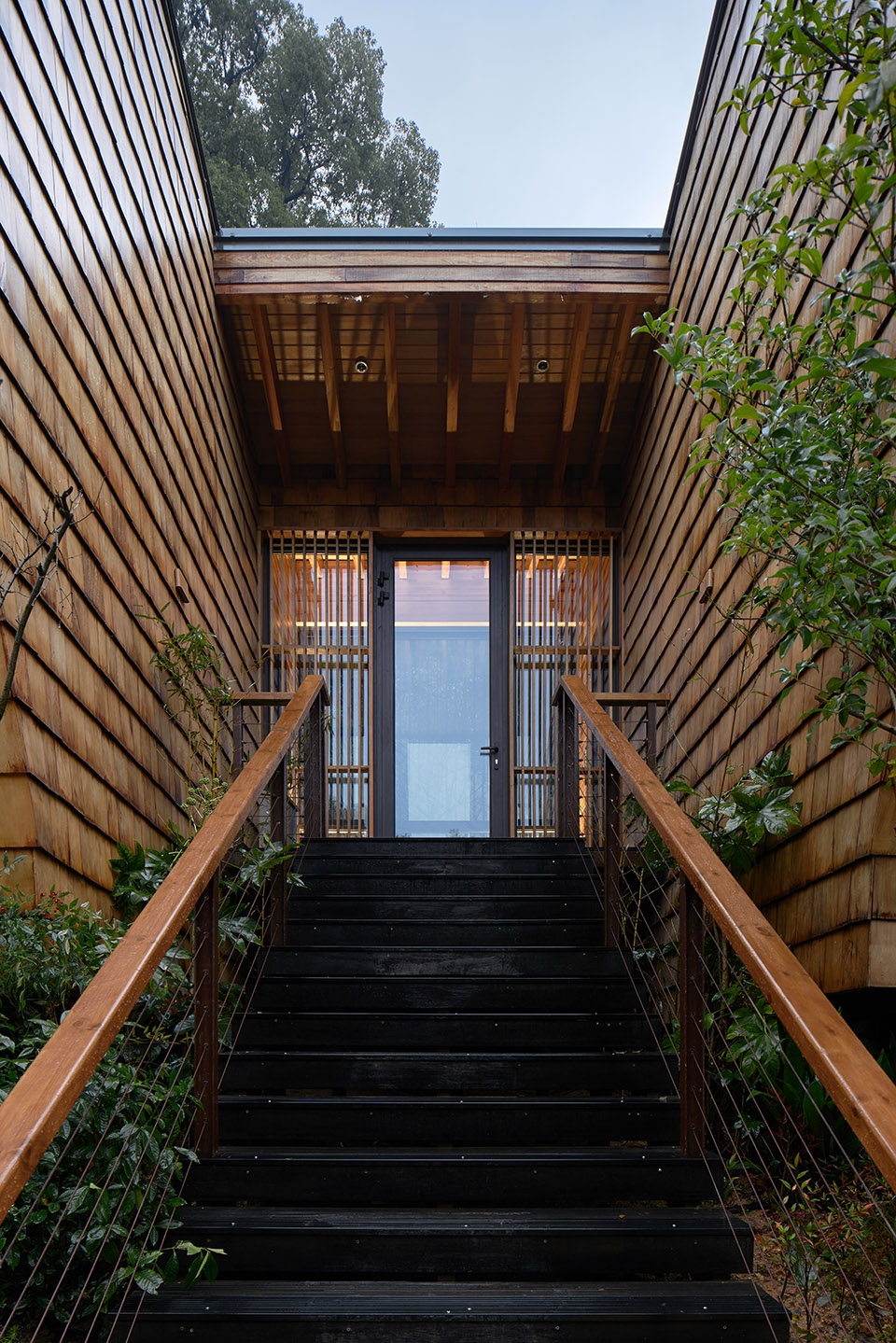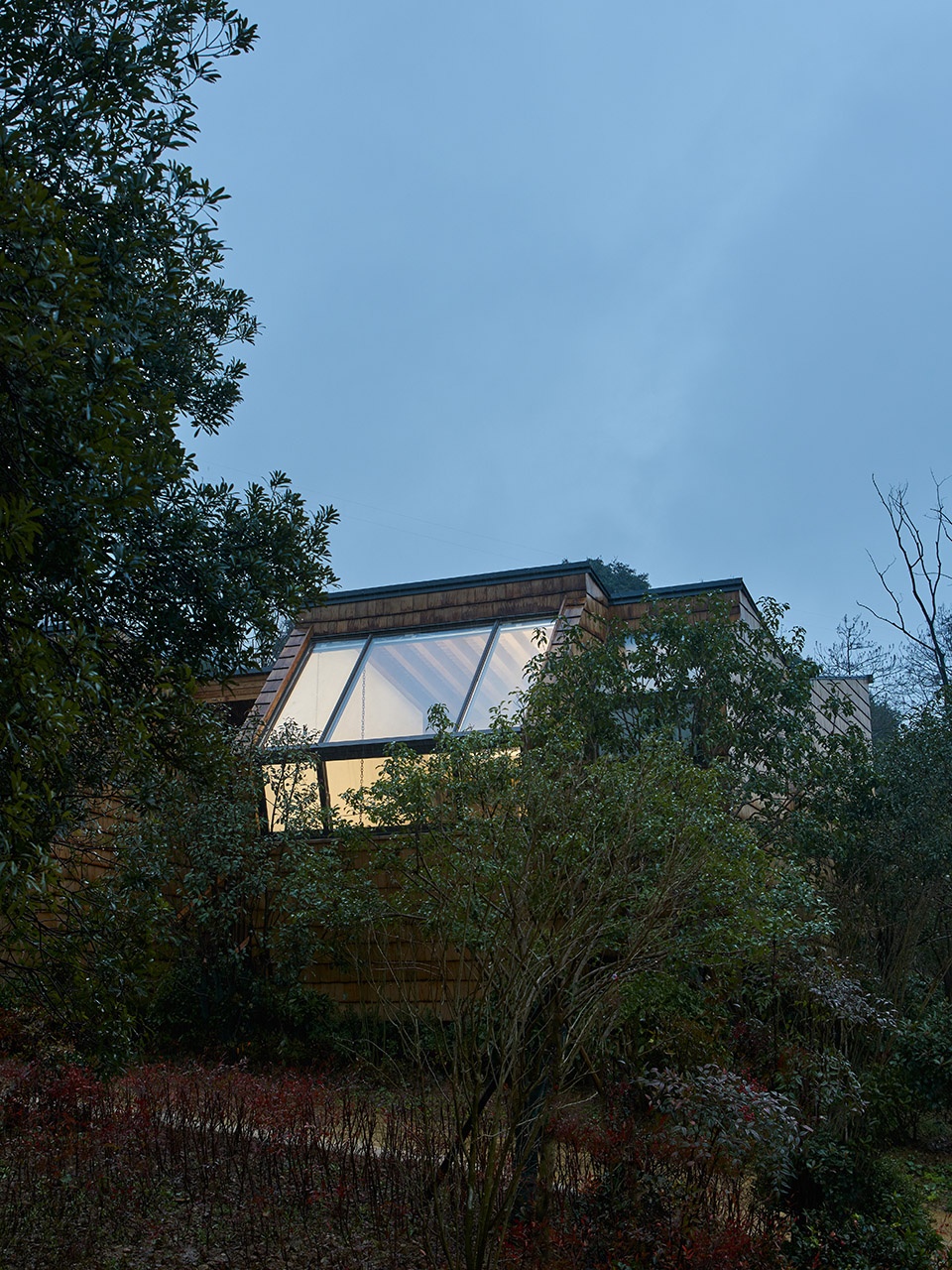 Three years ago, we came to the project site for the first time, rambling through a dense, tall and zigzagging bayberry forest. The sunshine scarcely penetrated through the gaps between branches and leaves, scattering some mottled light and shadows on the ground, that was quiet but somewhat gloomy. As I walked into the open place outside the forest and unconsciously looked up at the bayberry forest in front of me, I suddenly felt an impulse to “rush” out of the forest. Instead of being alone, architecture should “grow” along with large trees, and create an upward tension, a posture of co-growing with environment in combination with the site slope and bayberry forest. Hence, the concept of “Star Cube” is approaching like another kind of organic living that looks up at the starry sky together with bayberry trees on this site.