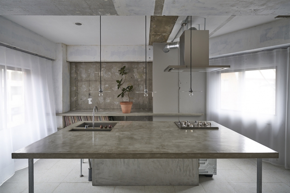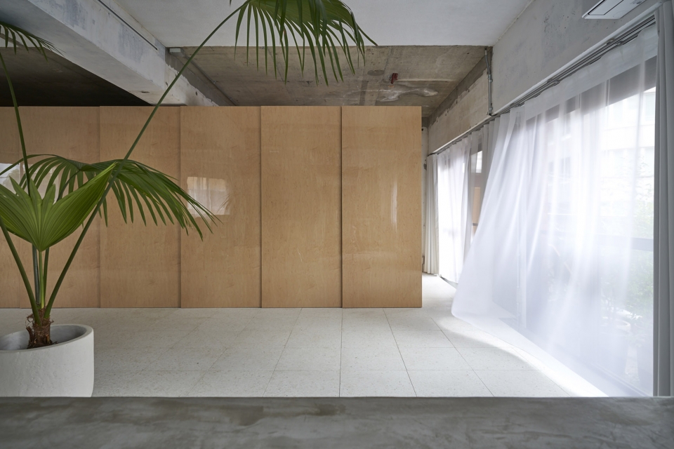 This is a renovation of a 40-year old apartment in Tokyo. All rooms had sufficient light and wind from many windows along south and north walls facing wide streets. We converted the three-bedroom apartment into a large open space and let light and wind pass through in order to make the best use of the environment. In an open plan space, we need to consider how to locate spaces involving privacy including a bathroom and bedrooms and how to provide enough storage spaces. Our solution was to provide a large closet spanning the entire width of the room.