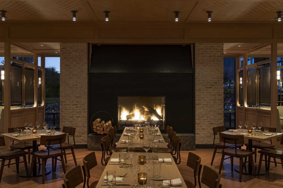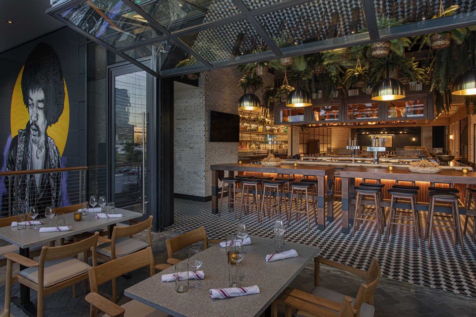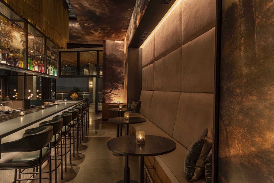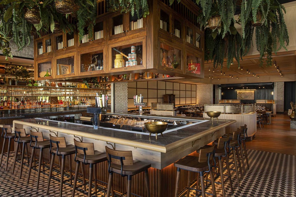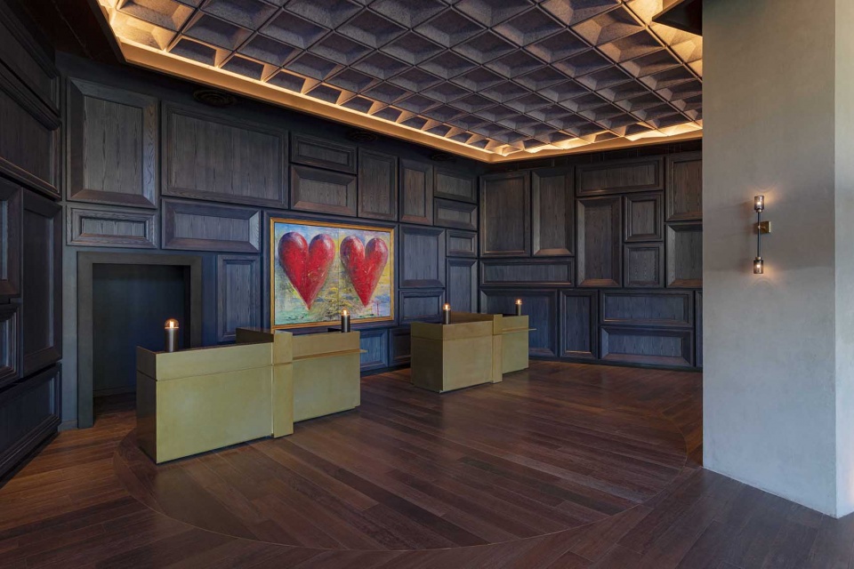 All-day dining restaurant The Dutch, from acclaimed Chef Andrew Carmellini, offers a fresh take on classic American design, with nods to handcrafted industrial elements, Shaker Style, and southern residential hospitality with relaxed residential furniture and art. The entry foyer features an inlaid tile logo and tile walls, complemented by the walnut and brass host stand, and the oversize blackened steel fireplace with a vintage door. The restaurant has an airy, garden feel, thanks to a mix of bleached oak, contrasting walnut wood and aged white brick accents. The island bar is surrounded by green leather banquettes nestled in wood-frame niches. Perforated metal screens create a feeling of separate rooms and give a sense of multiple thresholds, while also filtering light into the dining room. The PDR has custom Shaker Style table with carved warm walnut legs, while the room is clad entirely in blue panelling. Chef Carmellini’s second restaurant, the evening-only chophouse Carne Mare, is a mash-up of a contemporary and Old-World Italian trattoria. The open seating plan focuses guests’ attention on a glass-walled show kitchen, while the intimate steel-framed, glass-enclosed dining room has a barrel- vault ceiling and leather banquettes. The warm walnut millwork and brass accents gives the space a moodier, rustic feel that complements the rich ebony wood floor. Plush custom leather barstools invite guests to pull up a seat.