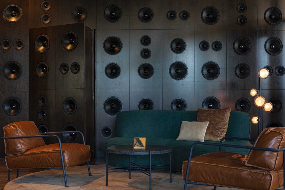 The corridors leading to guestrooms and suites have a graphic, directional carpet and Rockwell Group’s “Groove-V” wall covering from Maya Romanoff. Rooms are inspired by vintage stereo equipment and Nashville’s more intimate moments. The bathroom can be open to the room or hidden behind sliding panels. The large, singular bedhead anchors the room with curved upholstered back that connects to a built-in daybed. The guestrooms feature a commissioned silkscreen by the Brooklyn-based artist duo FAILE for the hotel, completing the design.