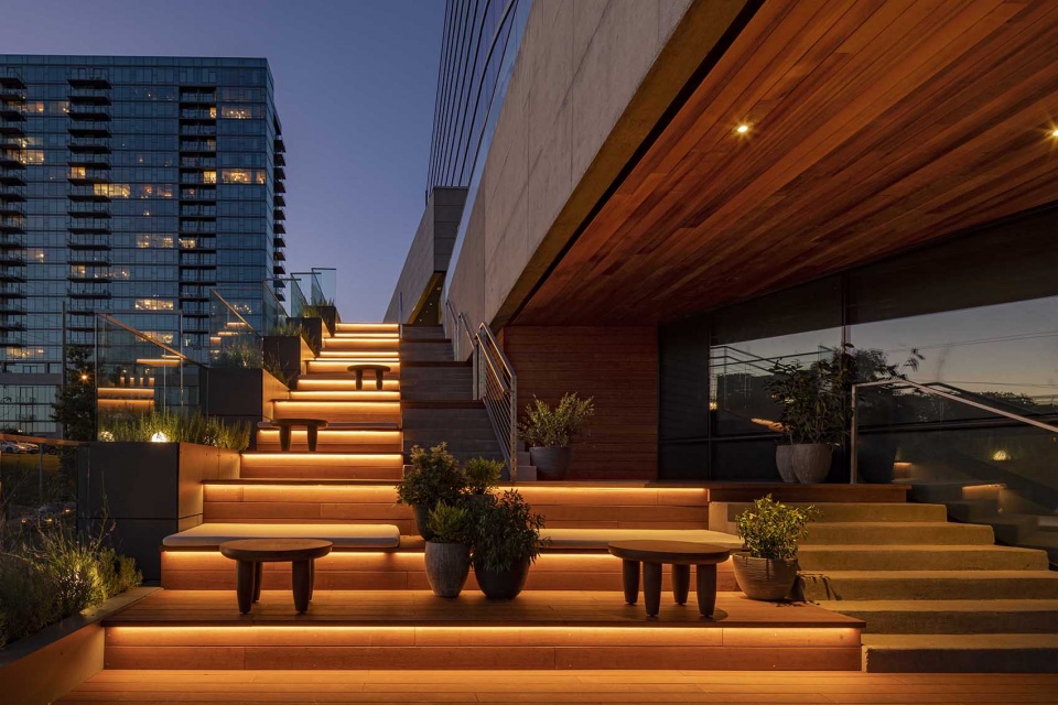 The hotel boasts a dramatic pool area, featuring a pool bar and private cabanas with wood screen walls. Nearby, the ballroom’s design was inspired by the quilting techniques of Nashville artists. Its metal-and-glass framed corridor façade creates some transparency between the event spaces and pre-function area and brings daylight all the way through the floor. W Nashville’s rooftop bar takes its inspiration from the structure of the famous Gulch railroad, with movable FF&E, a fireplace, utilitarian vertical sliding garage doors around the perimeter, and backlit end-grain wood panelling made from reclaimed wood beams from a local tobacco warehouse originally built in the 1800s.