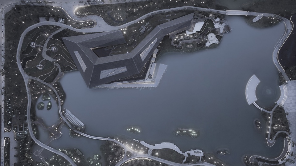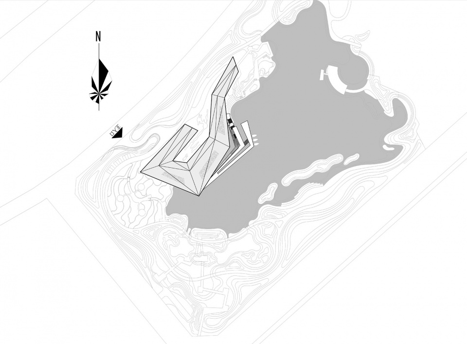 The consistency of roof has cultivated, created proper atmosphere for visitors with different activities. It is also a transitional space between outdoors and indoors. Natural lights can go through the architecture freely because three large scale roof windows and all the light penetrable surrounding glass curtain wall. And because the application of glass curtain wall, it makes the building floating above the lake in front of it.