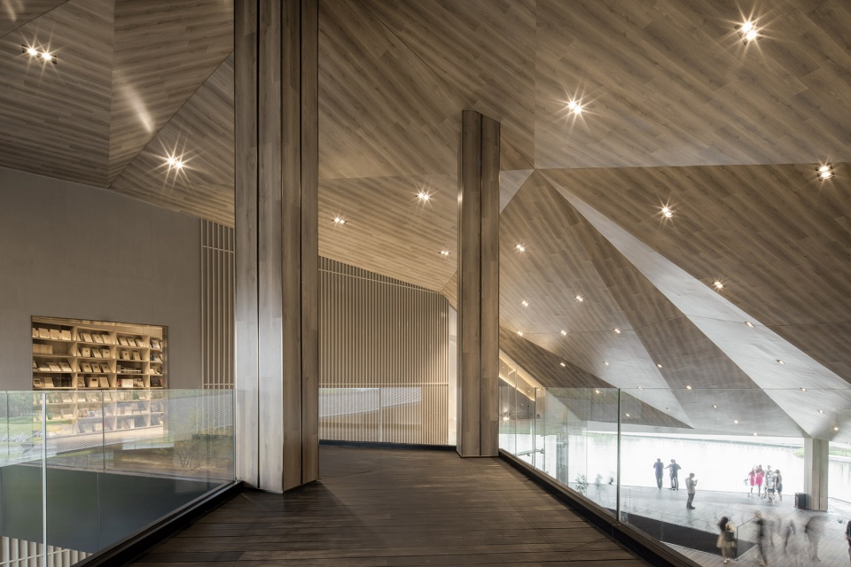 建筑连续的坡屋面有效地营造了连续的外廊空间,成为访客提供静坐品茗、凭栏眺望的场所,也是建筑与环境过渡、融合、室内外情景交替的空间。屋顶三大片天窗为室内的博物陈和阅读提供了良好垂直自然光线,与屋檐下四方落地的连续玻璃面一起,创造了一个通透、自由而连续的空间,让视线可以肆意穿越,建筑也由此 “浮”于水面。