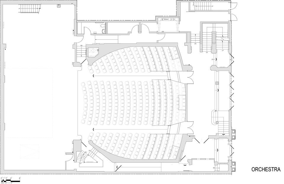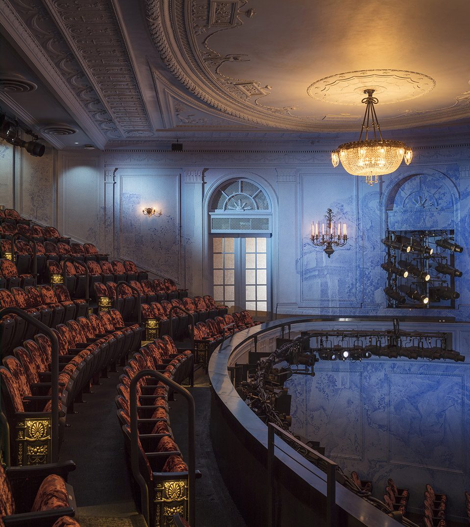 The lower lobby of the theater has been restored to its original use as a gathering space and concessions area for theater-goers before the show and during intermission. Private offices on the third floor were reclaimed as dressing rooms and a green room. A new public space was added by the Rockwell Group design team: a multipurpose room for play readings/workshops during the day and for use as a donors’ lounge during performances.