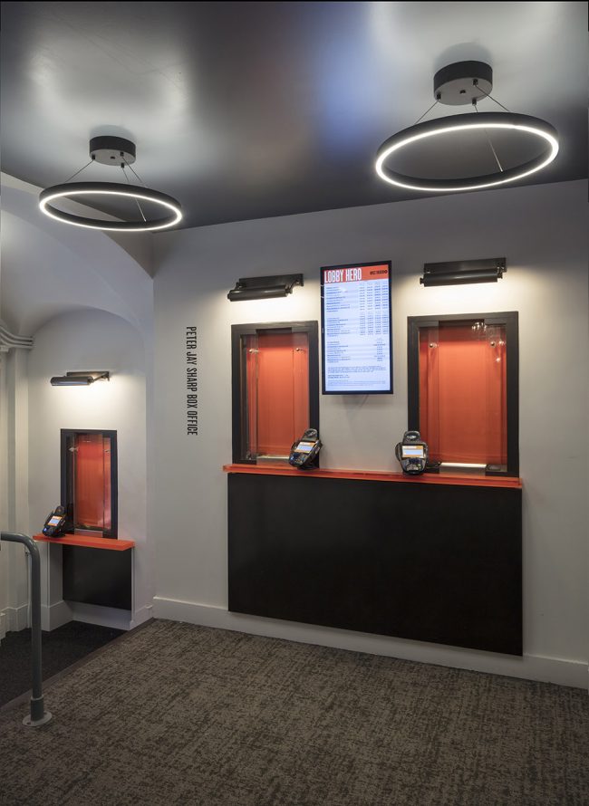 iridescent copper fabric seating and glossy black light fixtures give theater a fresh look that blends its history with Second Stage’s modern style