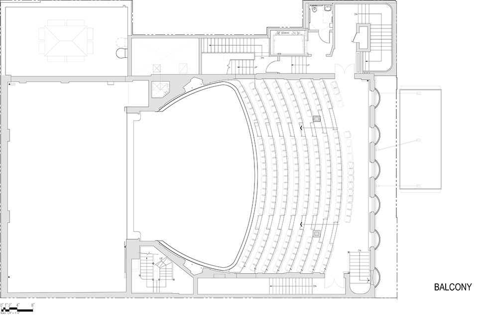 剧院大厅的下层维持了其原始功用,供戏迷们在演出先后及间隙在此聚集讨论。原位于剧院三层的办公室被改造成更衣室和演员休息室。此外,设计师在该剧院中引入了一个全新的多功能公共区域。白天该空间可作为工作坊和读书区,夜晚演出期间这里便转变为临时休息空间。