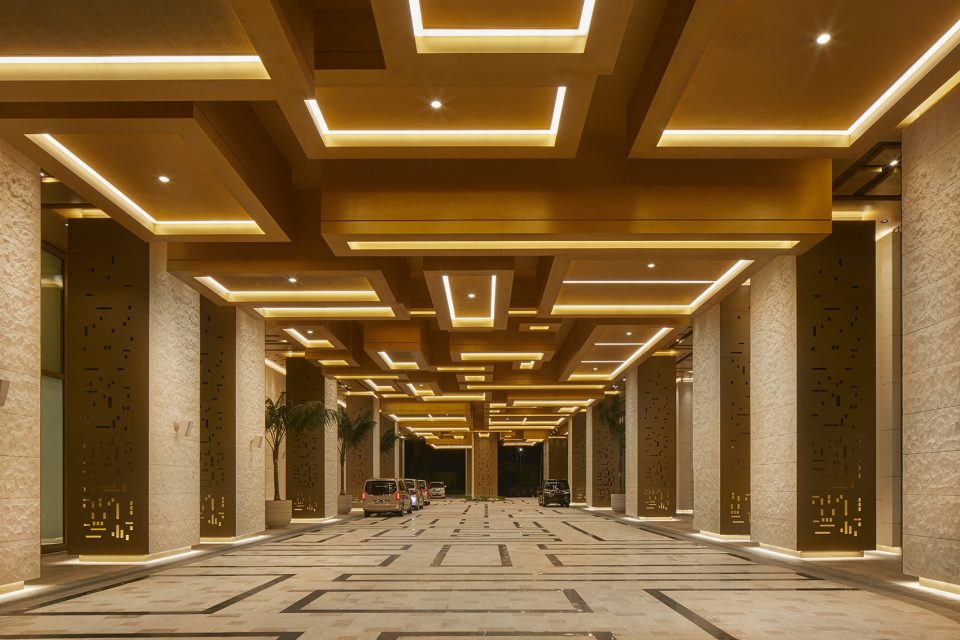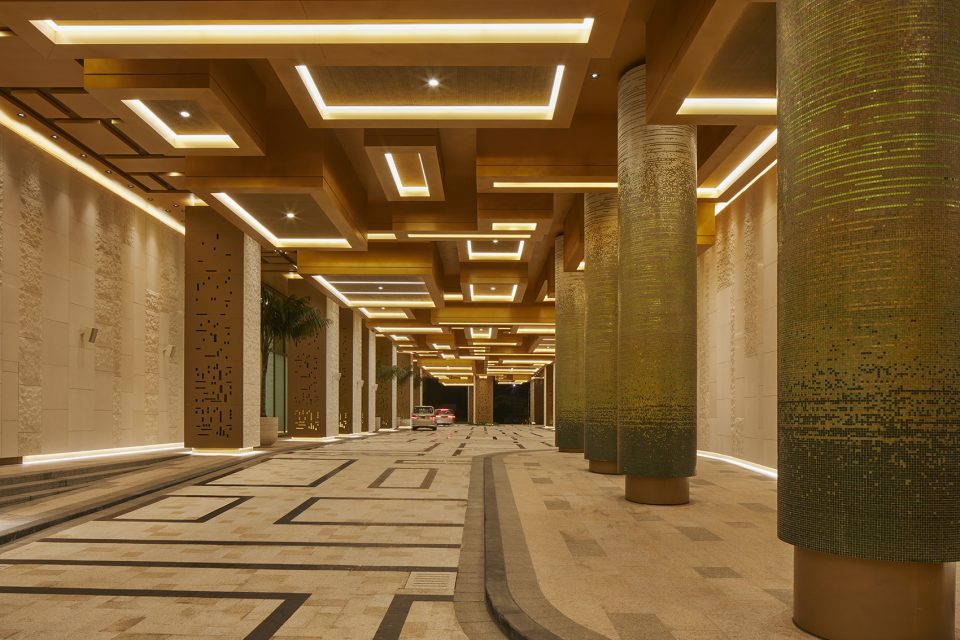 This VIP entrance begins at the street level with a metal gate, wood surround, and stone portal. The porte cochere continues the jewellery box language of the towers, with stacking wood boxes on the ceiling and stone columns clad in backlit bronze metal laser-cut screens.