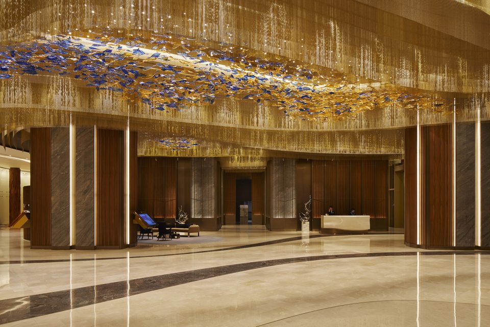 The hotel lobby features a series of monumental bronze and walnut-paneled columns with adjacent stone shields. Designed to evoke gates, the columns contain lounge areas, while sinuous bronze and marble inlay in the stone floor gently guides circulation. A sculptural glass chandelier floats overhead, while curving gills of beaded chain diffuse the light and emphasizes the flowing elements.