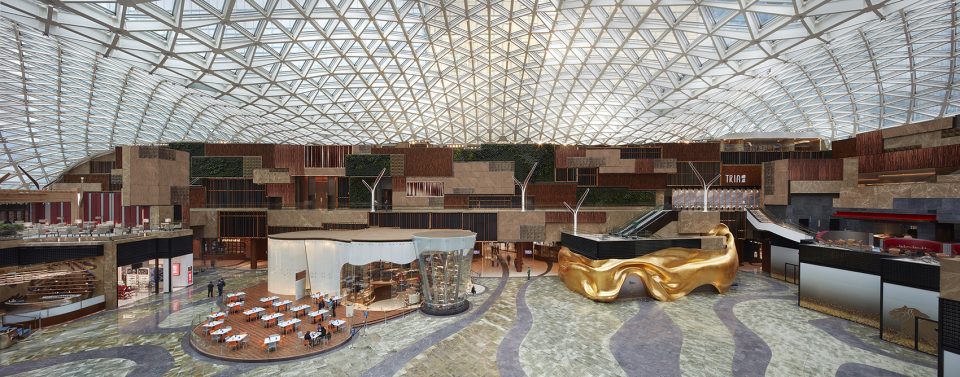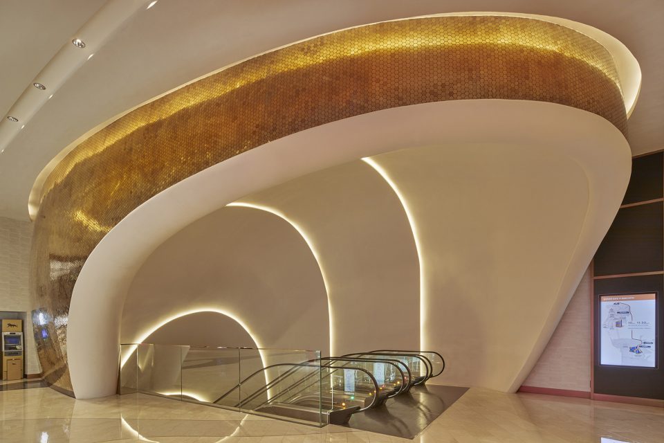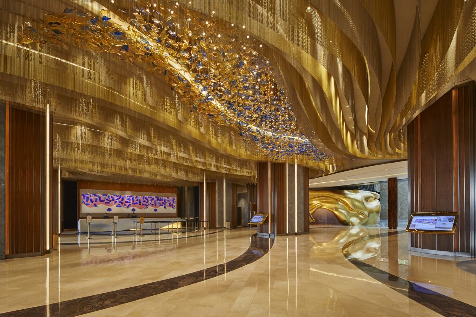 Set to be the new luxury landmark for Cotai, MGM Cotai is inspired by local culture, the stacked boxes of the compelling towers have been shuffled and cantilevered to create a single modern sculptural form, mimicking glittering gold Chinese jewellery boxes. Within the hotel’s public spaces and amenities, Rockwell Group has introduced intimacy and discovery to the hotel’s lobbies, retail corridors, a traditional Chinese restaurant, and The Spectacle, a football-field-sized, glass-topped atrium at the heart of the project that acts as an intersection for the projects multitude of amenities. Several related design concepts have been woven through MGM Cotai’s public spaces. A starting point for the design was to view MGM Cotai, and Cotai itself, as the axis between east and west. Once ruled by Portugal, Macau reflects a mix of vibrant cultures. Feng Shui principles have been introduced together with motifs to signify good luck, which have been blended with western design concepts and allusions to nature.