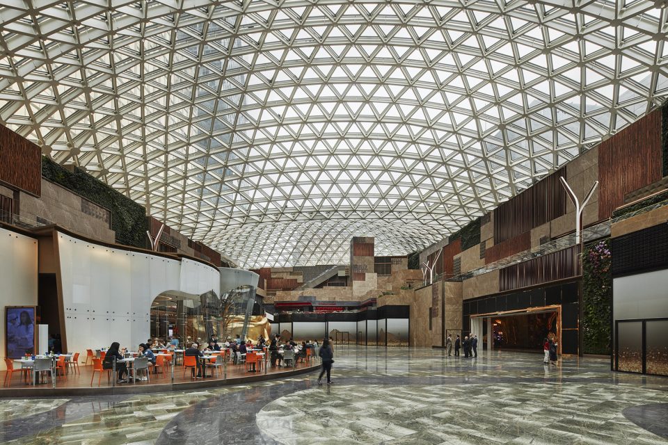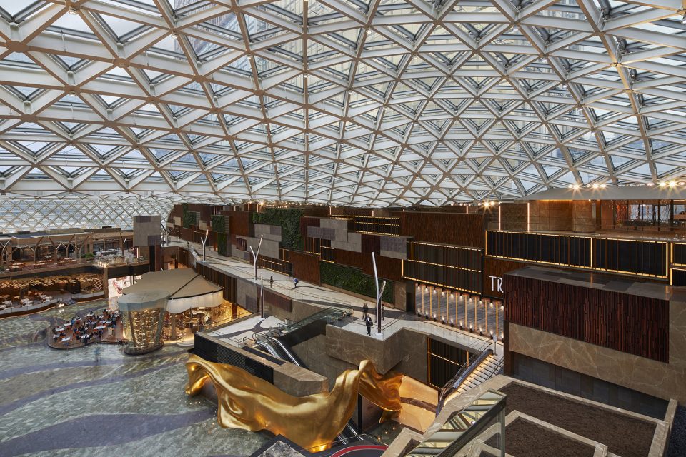 The heart of MGM Cotai, The Spectacle is a two-story glass-domed atrium ringed with retail and dining, providing plenty of un-programmed space for changing exhibitions and events, and a sensory reprieve between activities. Serving as the connection between the hotels, casino, retail corridors, and other amenities, The Spectacle can be viewed as a central park or town square. Tiers of floating, bronze, wood, and stone volumes contain seating and lush greenery and break down the articulation of the space like a quarry.