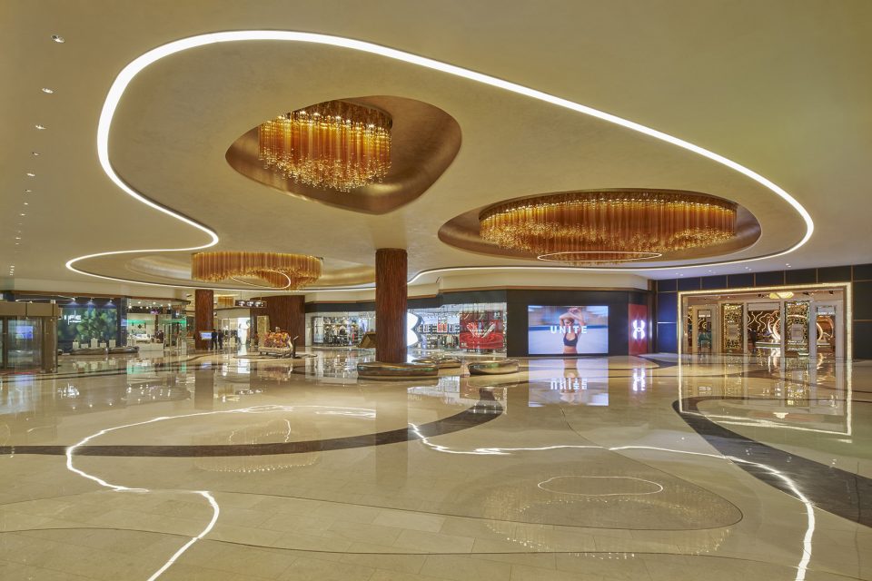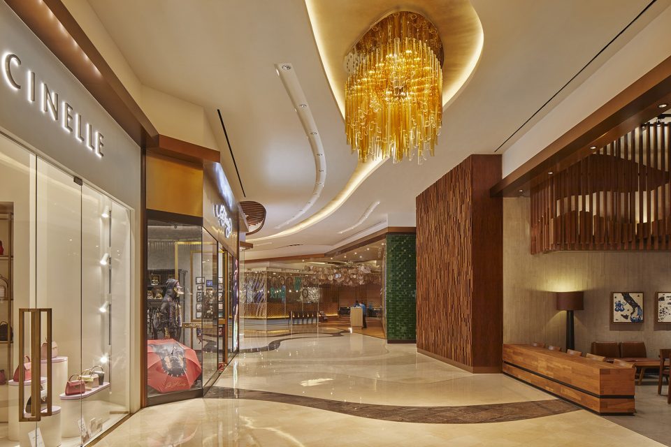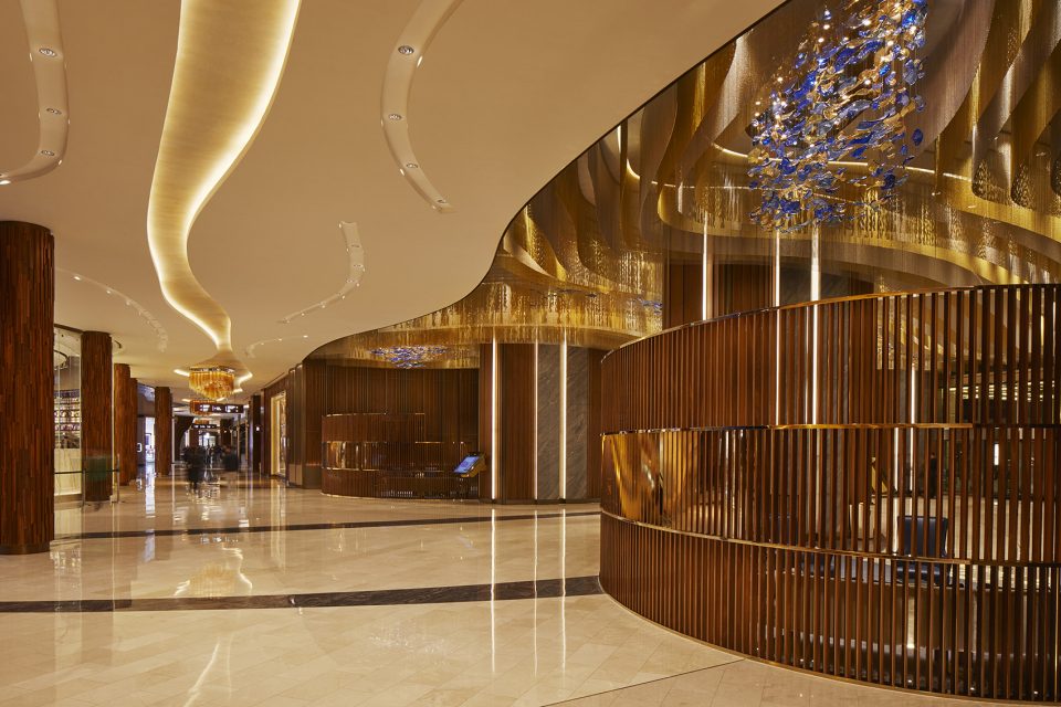 The retail corridors are conceived as rivers converging at The Spectacle—the east-west axis of the property, which is like a central park—carving and eroding the landscape as they move through. Wood, metal, stone, and glass are layered in sinuous, organic forms, while, at times, the jewellery box exterior of MGM Cotai is referenced inside, with stacking boxes and layered, floating landscapes.