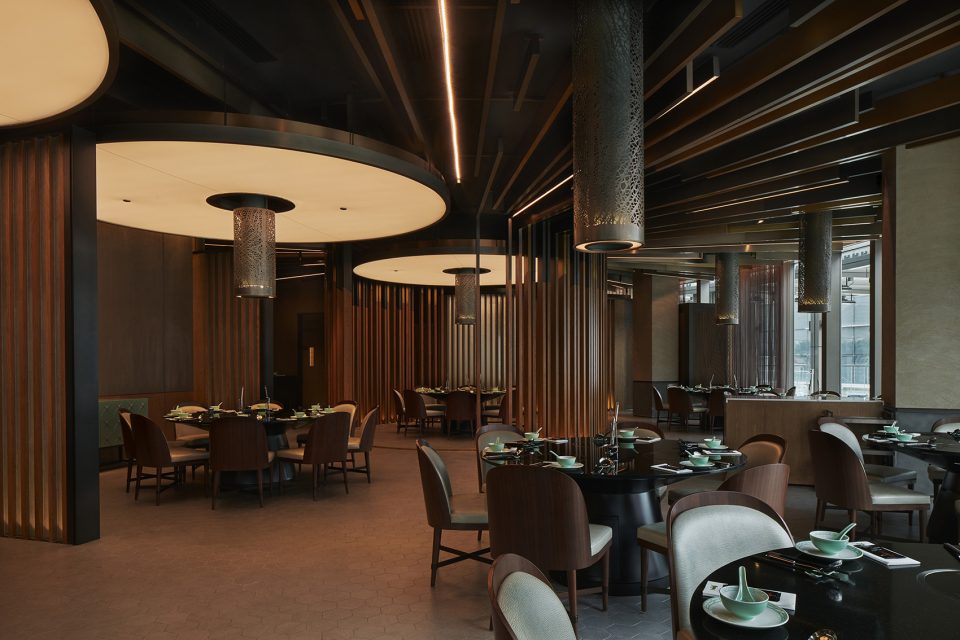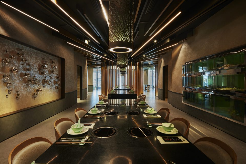 Hao Guo also has a separate area, which is a moodier, more intimate space with concrete floors featuring inset tiles with Chinese calligraphy. Inspired by the rich heritage and cross-cultural distinctions between Chinese and Portuguese fish markets, the design is clean, industrial, and modern. A large communal feature table seats 12. In the ceiling, ribbed, wood timbers emanate out from the entrance, creating an explosive effect. Cylindrical, dark metal hoods above the tables are laser cut with patterns of leaves. PDRs are hidden behind vertical bronze screens and can be combined for larger parties.