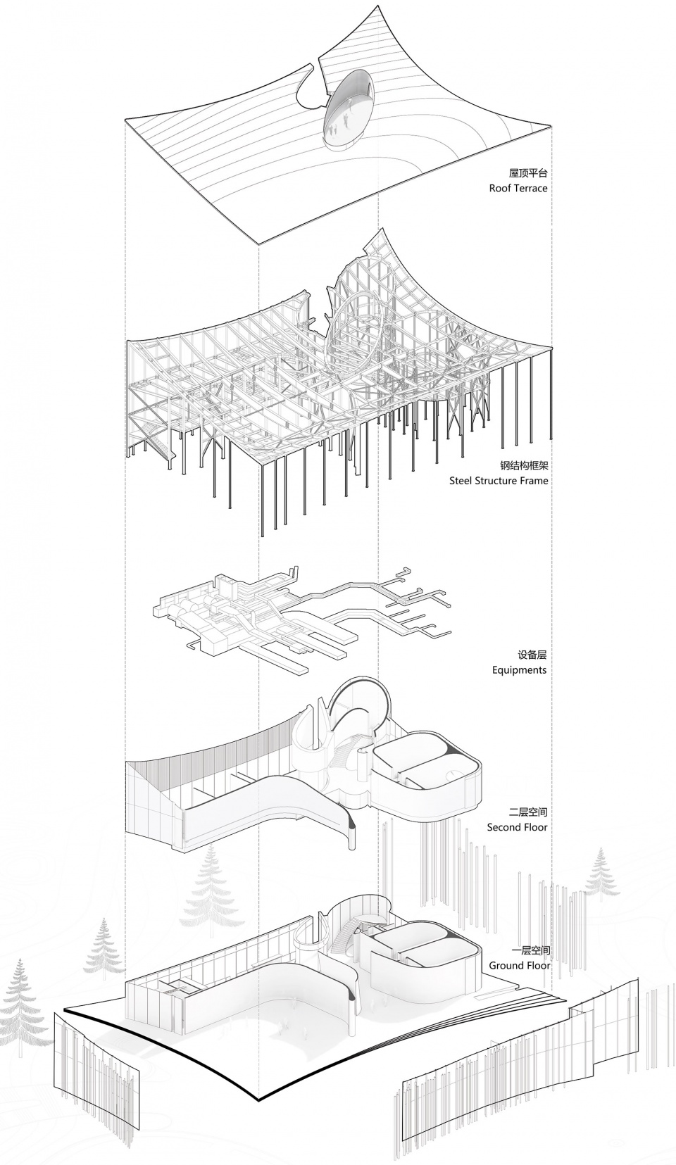 我们把这样的场景带进这个亲子中心的设计里,设计了一个卷起的地面,好像起飞的魔毯。然后把这部分抬拉起来,形成屋面,在这里只留下远山树林,天空和白色大地,好像鸟视角一样。屋面和地面间形成了一丝丝的粘连线,你可以想是撕开的奶酪,这些粘连线成为了白色丛林,立面的构成部分。这是重要的初始部分。