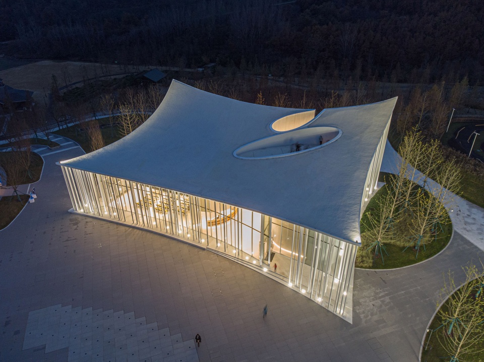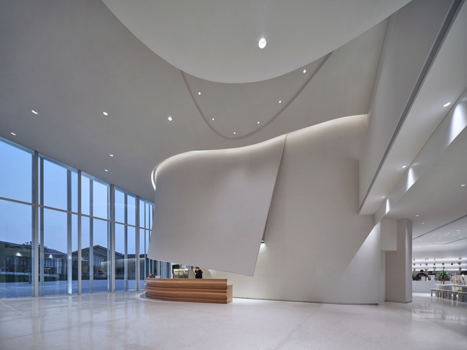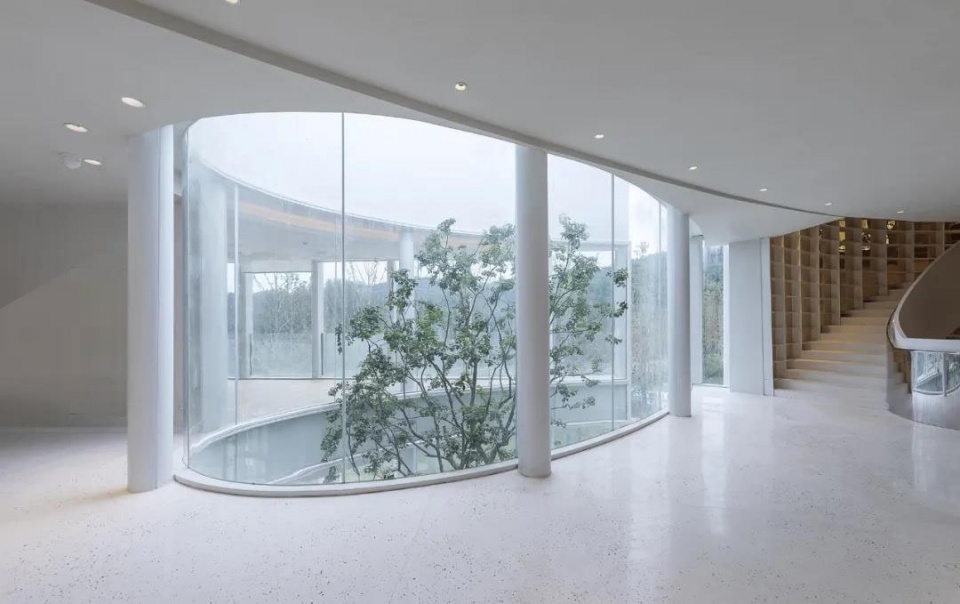 Three sides of the building are glass curtain walls, bringing light into the building efficiently, and there’s a water drop-shaped transparent yard, which we want more natural light to come in and scatter on the indoor curved walls to brightens up the interior.
