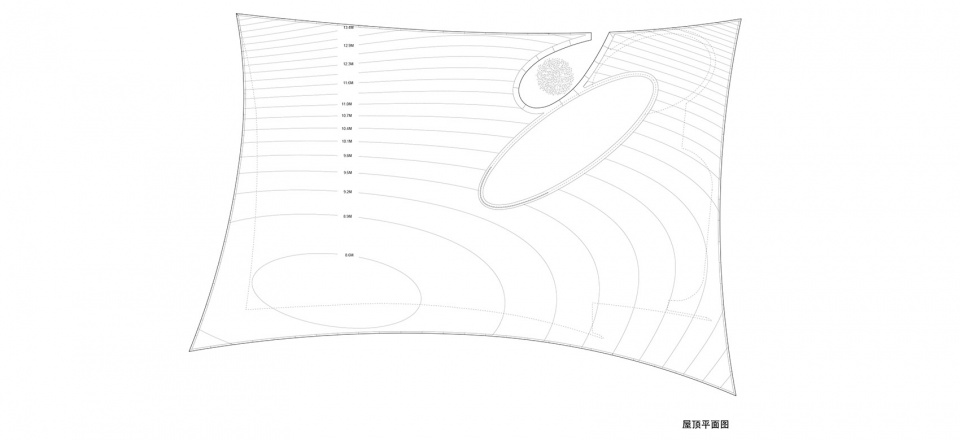 开始我们希望屋面是一个无边界的包裹的白色毯子,但因为始终没有很好解决安全的措施,做成了现在这样有限可达。这是非常遗憾的事,到建成后我们还在讨论这个措施,因为一个白色的屋面并没有意义,卷曲可以奔跑的屋顶才有意思,不幸之幸是屋面的整体感不错。