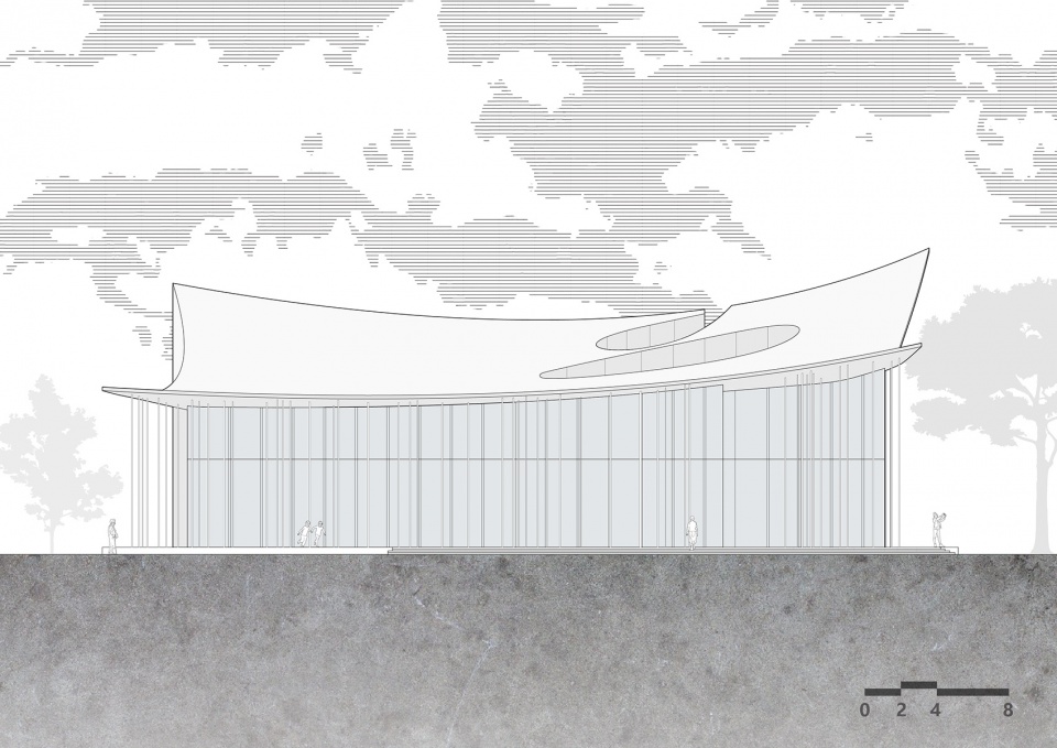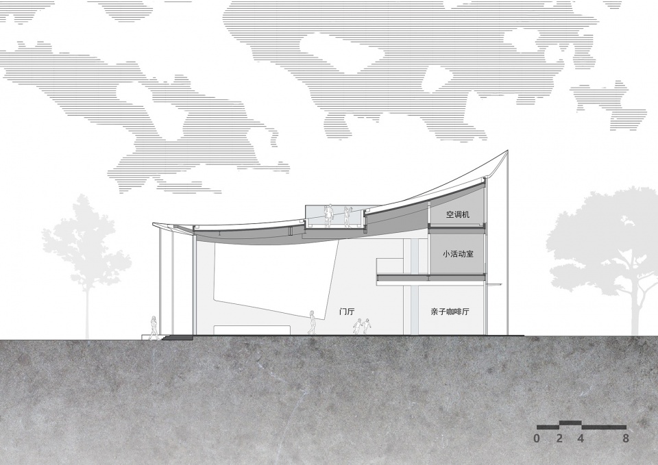 We brought this imaginative scene into our design of this Parent-Child Centre. We designed a rolled-up floor, imagine it as a magic carpet taking off, then we lift the carpet up and it became the form the roof. If you were standing on this magic carpet, just like a bird flying above, you would see the distant mountains and woods, the sky, and the white earth below. Between the magic carpet and the ground are adhesive strings, here you may imagine them as melted cheese, this is the white forest, work as façade.