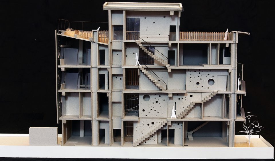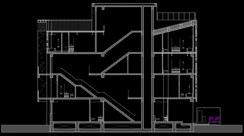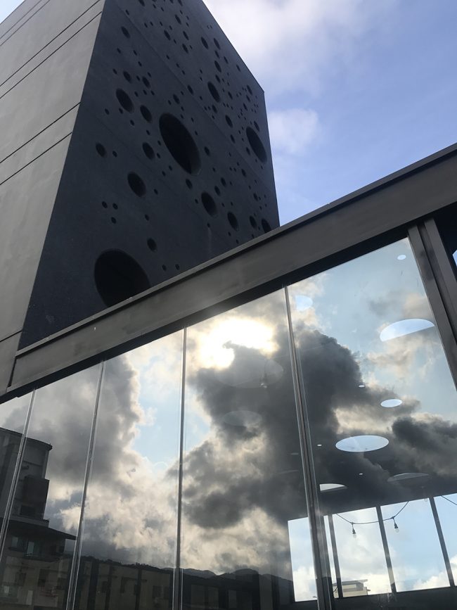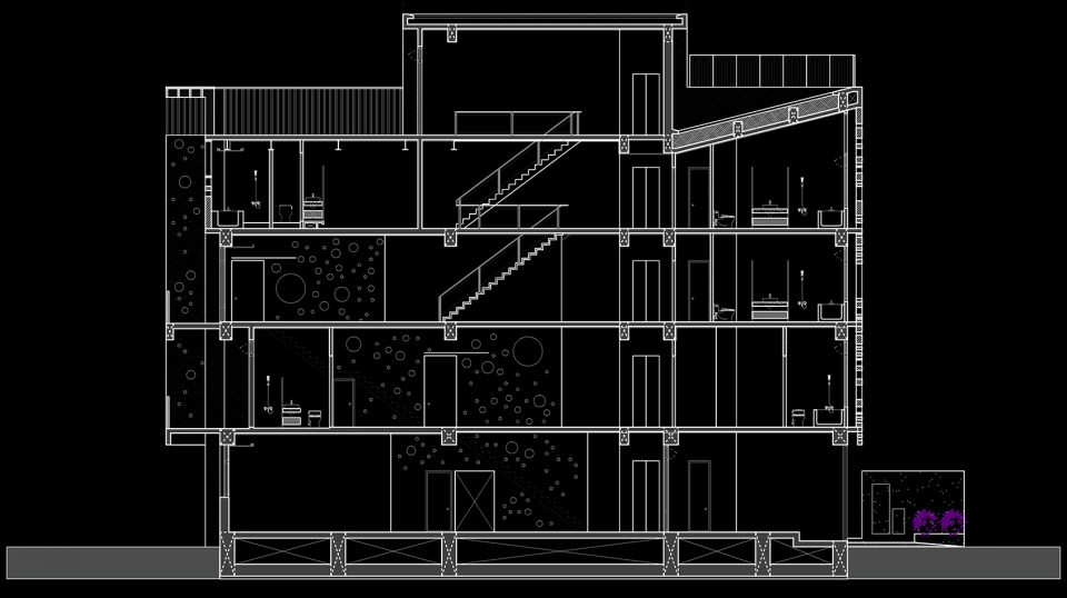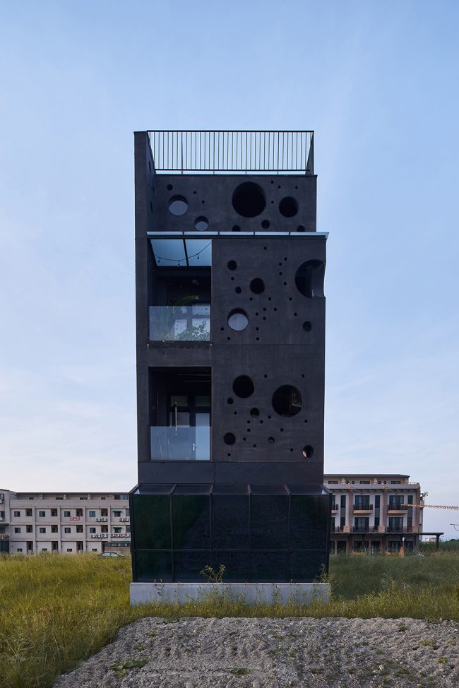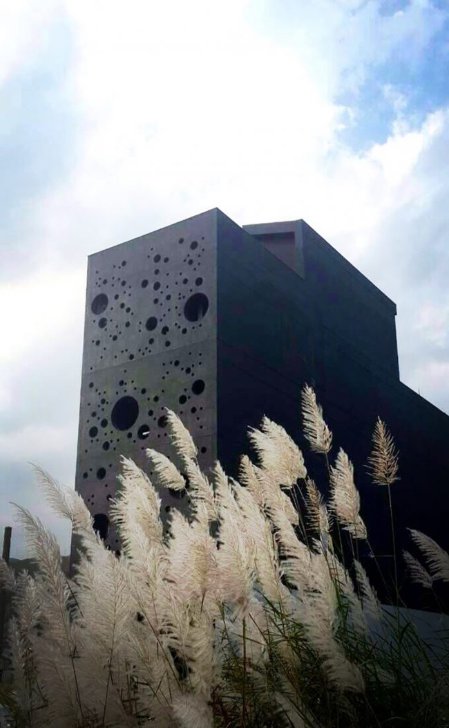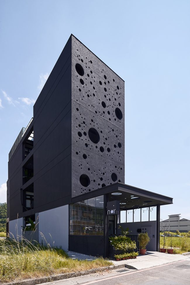 Clusters of round openings on the black façade allow light beams and diffuses inside like roaming foam in the air. The building morphs into an obscure lantern whose dim light glowing upon the voyagers.