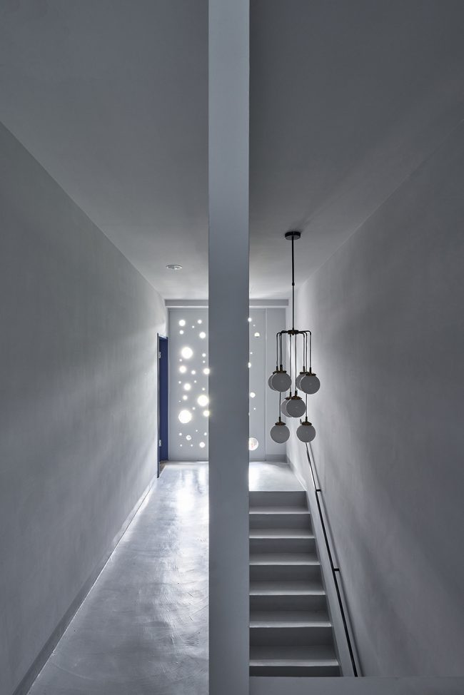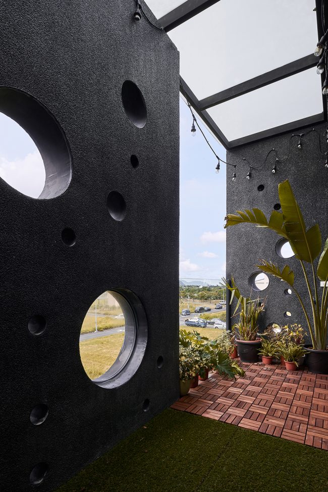 黑色立面上的一系列圆形窗洞使光束投射到室内,宛如泡沫一般在空气中消散。整座建筑好像一盏朦胧的灯笼,以微光照耀着旅行者的道路。