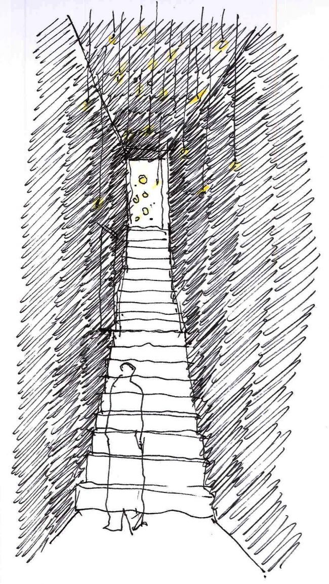 通过昏暗而狭长的楼梯便能够直接到达3层,颇有豁然开朗之感。这一空间体验模仿了从台北通向该村庄的一条最长的隧道:终点处的“星空”如同带领着你走进宜兰的开阔平原。