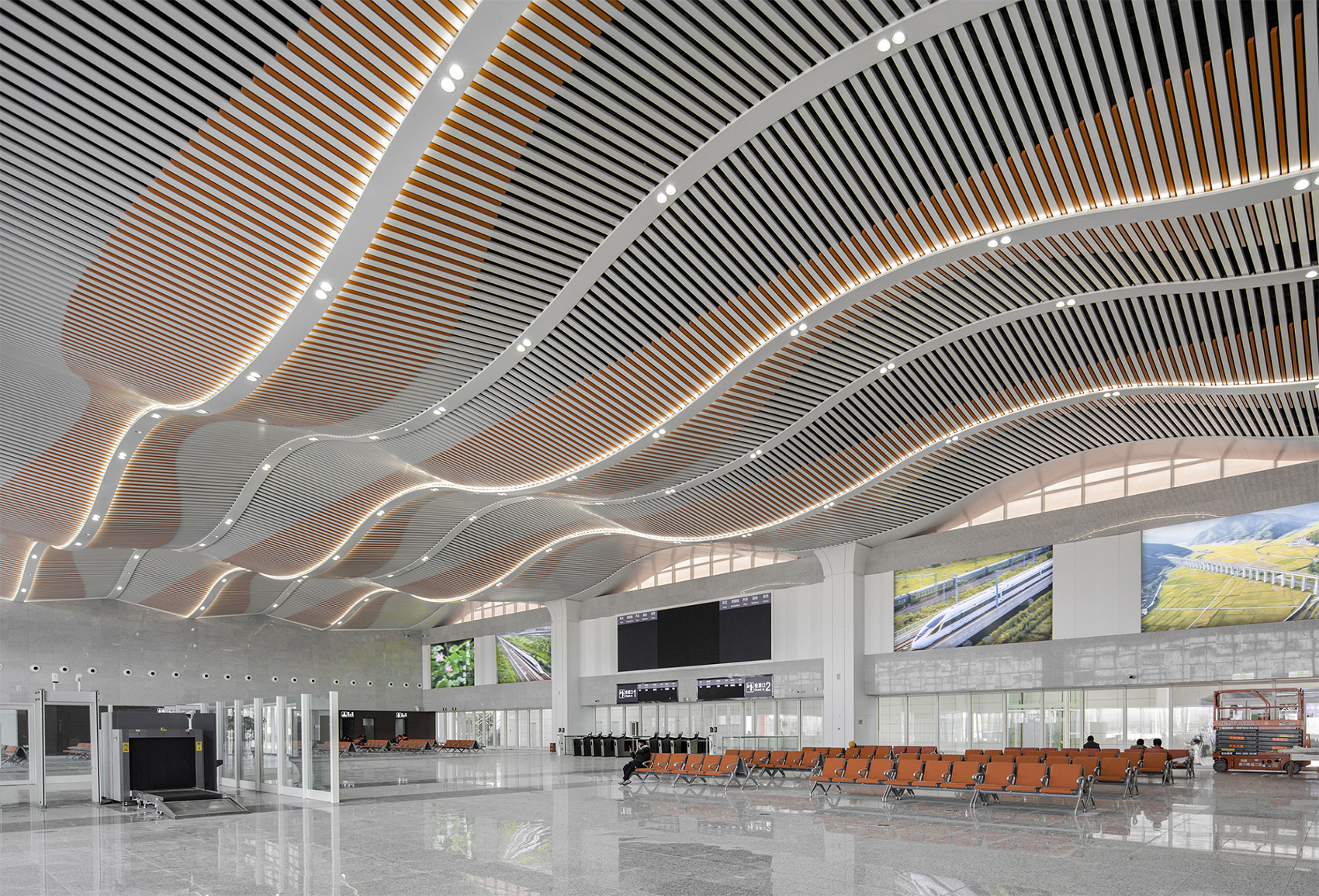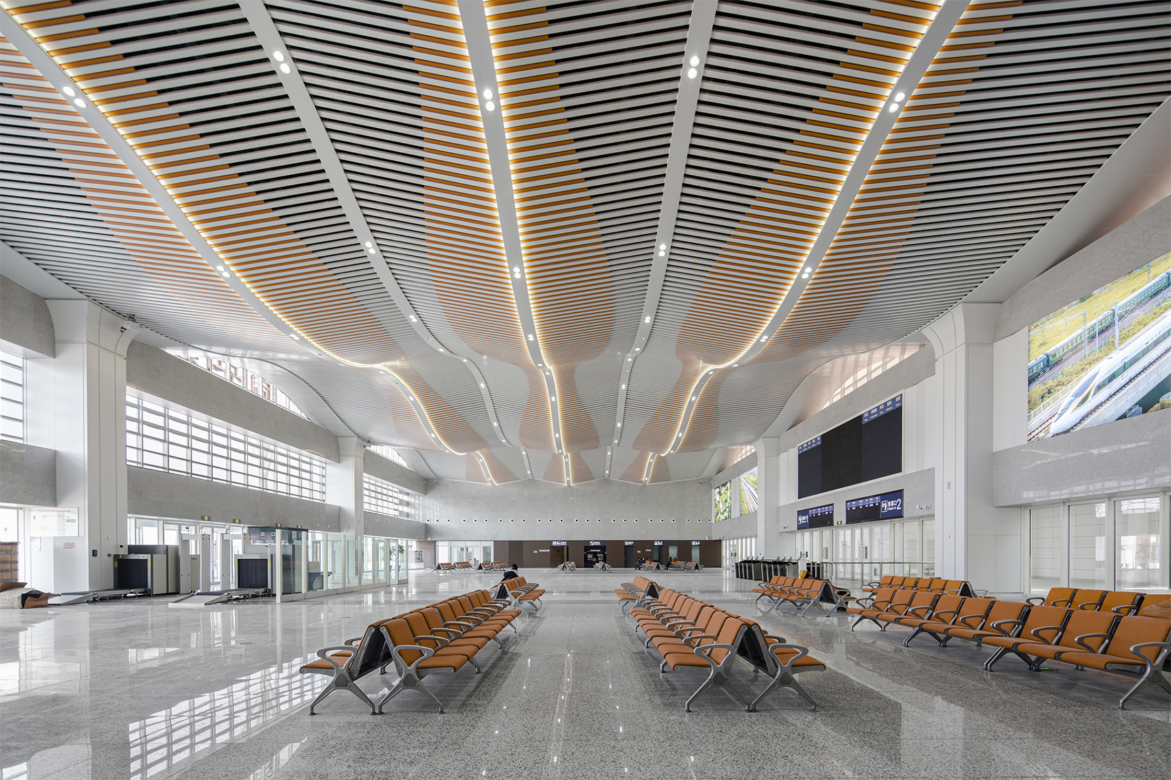 The wavy structure breaks the rigid modeling of the traditional flat sequence and forms a new sense of sequence, which makes the top of the waiting hall more light visually. Each of the three groups of vault is composed of staggered and orderly aluminum square tubes, forming a flowing visual effect. Lighting devices are placed on the middle ribs of each vault to cover the whole space.