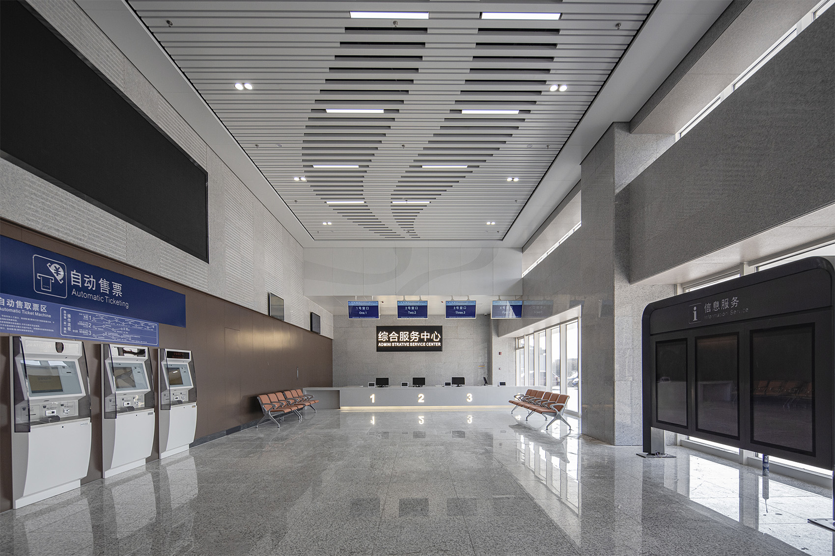 The space design of the ticket office and service desk is function oriented to create a comfortable, bright and generous ticket selling space.