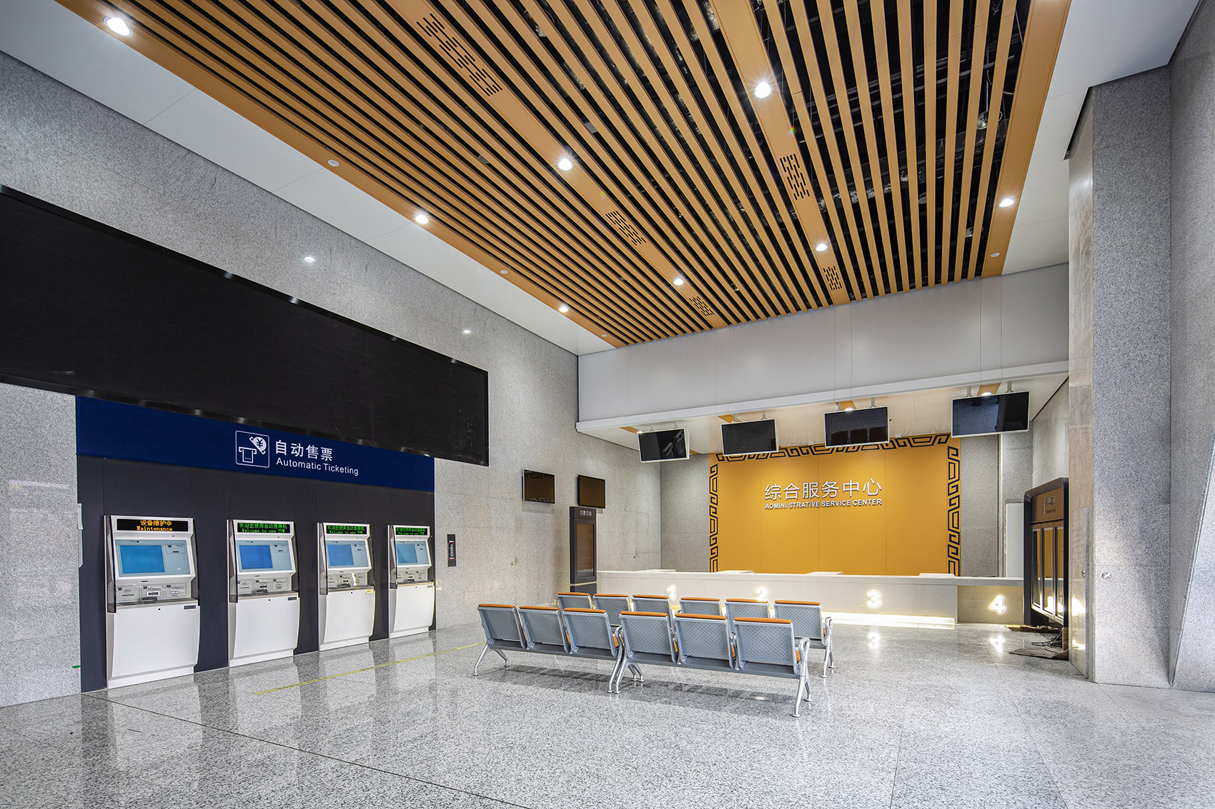 The customer service center provides all necessary facilities for commuters. The design elements of the customer service center are plane curve elements. The design language of the exit hall and corridor is relatively unified with the customer service center, which ensures the high consistency of the overall design style and emphasizes the sense of flow in the architectural language.