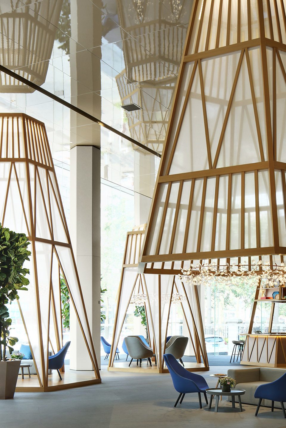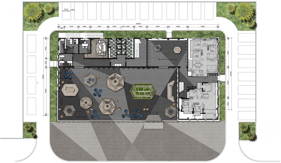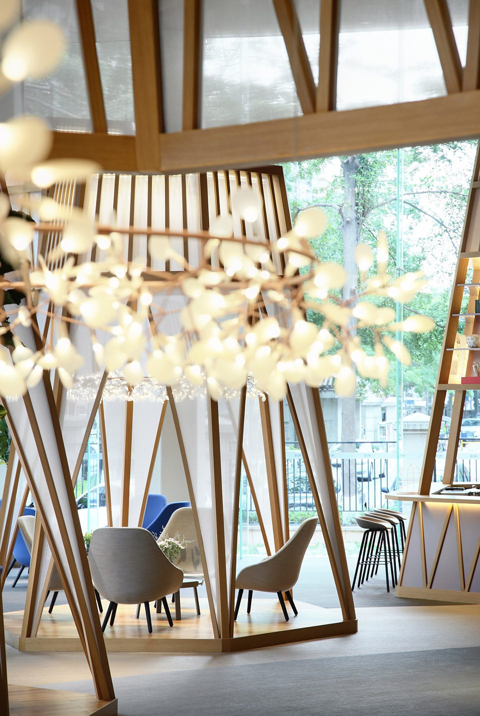 The single volume was divided into various functional sections through the simple and orderly arrangement. The barrier-free sight experience in all directions brings a balanced transition between inside and outside, apparently natural and harmonious. For the reason to partition distinct functional areas, the architect created several small-scale oak installations parallel to a pavilion and managed to utilize them in the planned layout. Indeed, it breaks a new ground of itself, and well-proportioned arrangement adds great vitality to the entire space.