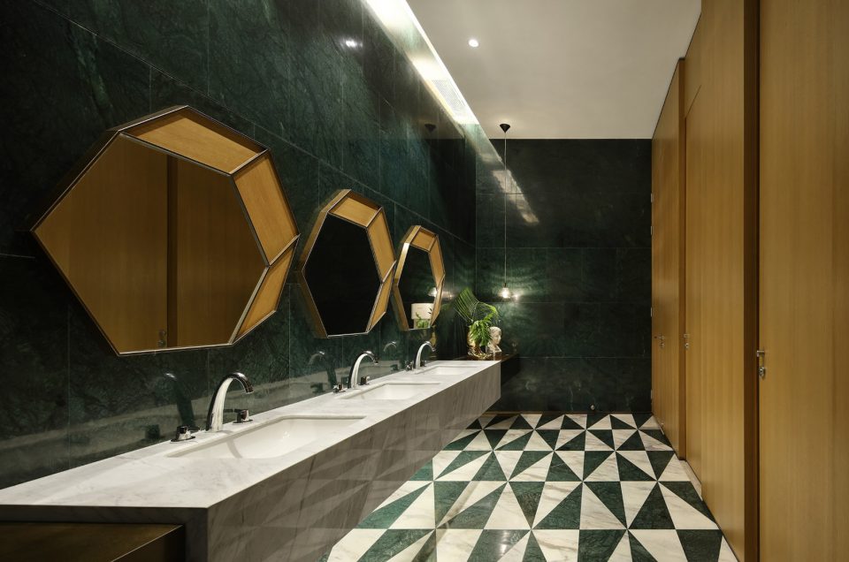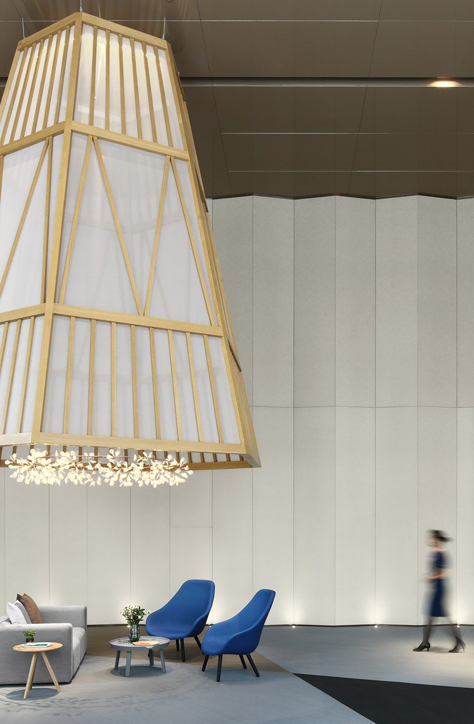 The interior wall parallel to the glass wall has been applied the same Origami shape, coming up with an unaffected ambiance of co-existence. Other supplementary spaces hide behind the wall and are connected by a passageway. Anteroom, women/men’s room and rooms on the higher level are accessible through the passageway individually.