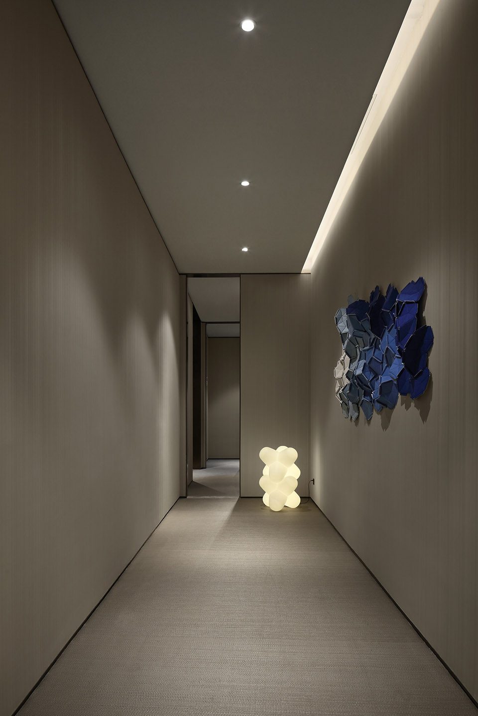 室内空间的内墙面采用和建筑同样的造型,达到“你中有我,我中有你”的自然状态。其他功能空间则藏于这堵幕墙后方,通过一条干净利落的长廊进行连接,可以到达接待室、洗手间以及二楼空间。