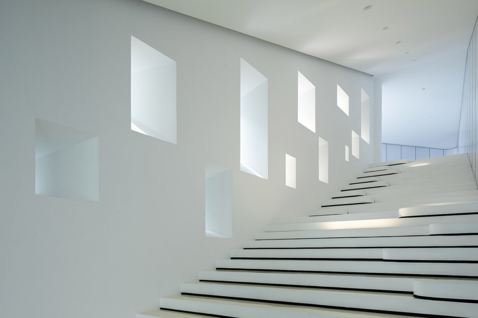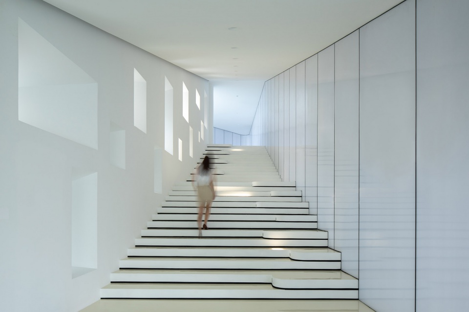 连接一二楼的大楼梯是最重要的一条动线,仪式中,每一对新人的必经之路,又是纯白,不加丝毫装饰。我们利用自然光为楼梯赋予更强的仪式感。“你面前的东西越少,你就能在每一样东西中发现更多。”你会发现投落在宽大阶梯上的曼妙光影,它们通过一个个喇叭状的采光口,将天井里的自然光传送过来,象极了柯布西耶在朗香教堂里创造的光的入口。人们透过窗口,移步一景地仿佛看见天井中的花草表演,走在台阶上的每一步,都令人充满了与自然共存的喜悦。眼前这片白茫茫的画面,突然有了宗教感,一种难以言表的神圣,令人不自觉地放慢脚步,屏气凝神,思绪万千。新郎牵着新娘的手缓缓走下楼梯,他们在想什么?第一次相遇、第一次牵手、第一次拥吻……一切美好的画面,在心里响起了旋律,周围寂静无声,唯轻柔的婚礼进行曲委婉悠扬,他们彼此对望,没有开口,却已然听见了内心的合唱。