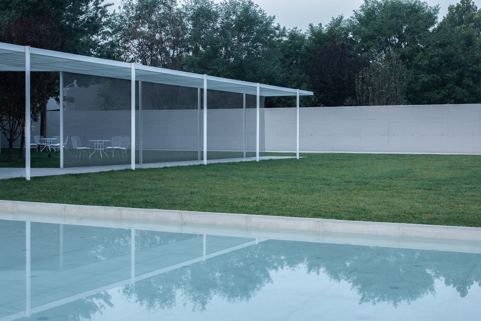 人车分离的双入口设计,让进入场地的初始就显现出不同寻常的趣味。主体建筑在入口处就能远远看见,但人们依然不时地被精心设计的前景拉走了视线,在正式进入宴会场地前,要先穿过混凝土错墙、跨越水池、游走连廊、环绕大草坪,仿佛经历一场动人心魄的爱情——明明爱情就在眼前,却要翻山越岭去追寻。入口处混凝土围合成坚固的墙体,象征着永恒,守护并见证着每一份来之不易的爱情。与之搭配的白色连廊,隔栅顶棚轻盈优美,阳光照射下,在墙上地上留下线条柔美的影子,婉约如斯。坚实的墙和灵动的顶,对比强烈,却又和谐统一,携手相依偎的身影,倒映在草坪前的水池中,一如在此留下美好回忆的一对又一对新人。