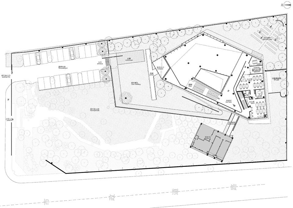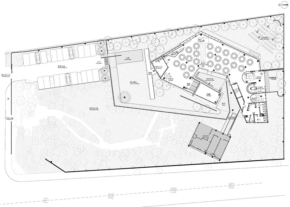 主体建筑为不规则几何体,近似梯形的平面中心,有一个内向天井,把阳光和空气引导到庞大的建筑体内部,照亮每一个角落。建筑深藏在绿荫中,后院有一个相对独立封闭的仪式草坪,前院的原始状况并非糟糕,石径小路、高矮花丛,一样不缺,有公园般供闲庭信步的景致,却缺乏配合婚礼艺术空间的气氛。因此在景观设计之初,我们便把重点投向了入口,一个充满仪式感和小惊喜的庭院将成为主体建筑的极富浪漫诗意的前景。