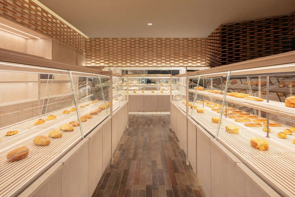 Jin Design Studio designed a space for Yamazaki second store which located in Metro City, following the Jiuguang store at Shang Jia Center in Shanghai. Different from the Jiuguang store, the design language of “wrapped in a floating bread is not suitable for the Metro City store due to the limitations of the site. But the interior design also express the concept was conceived: in many Japanese brands and the different class products large collection of the B1 level at Metro City, to create a sense of being wrapped by bread, make it separate from the diverse and complex business environment, and become the focus of the visual center of the whole shopping mall, and the sense of being “wrapped” is in the form of array type, to invite curious onlookers to come inside, is a totally open seamlessly wrapped expression of the space.