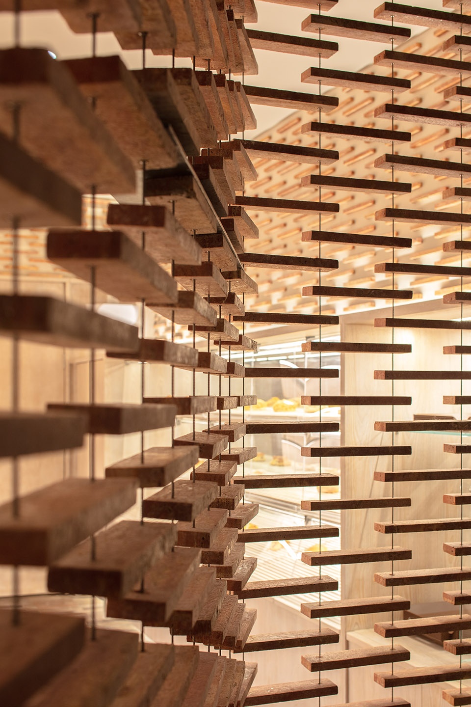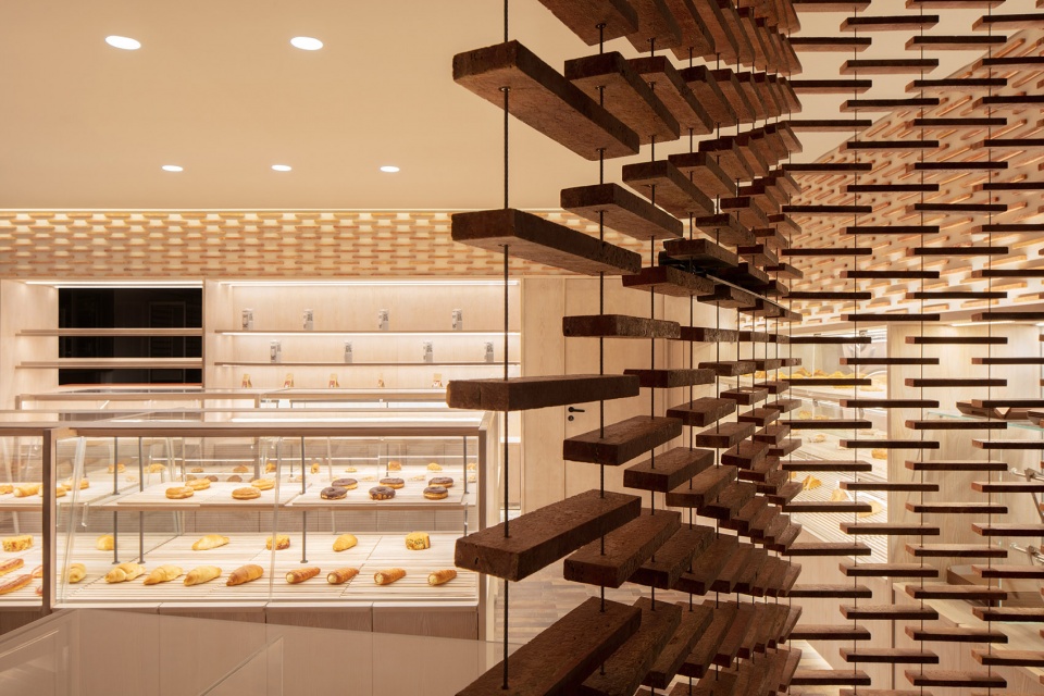 Jin Design Studio在美罗城店用了10000块天然红洞石来书写这种形式,原本坚硬冰冷的材质,经过切割和酸洗后,令感官变得极其柔和。天然的孔洞,相互交织、相互渗透,像极了刚刚出炉的面包,缝隙中溢出漫漫香味,和店内柜台里面包的诱人香气完美融合。无论谁从店面经过,都经不住被吸引,这种温柔的魔力友好而有力。