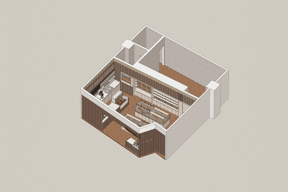 美罗城店是继上海尚嘉中心久光店之后,Jin Design Studio为Yamazaki设计的第二家门店。和久光店不同的是,美罗城店由于场地的限制,并不适合沿用“被漂浮的面包柜包裹”的设计语言。但同样的设计逻辑依然适用,那就是在众多日本品牌和不同类目产品大集合的美罗城B1层,创造一种被包裹的感觉,使其独立于商场多样而又复杂性的环境,形成独特的视觉焦点,且这种被包裹的感觉,是以阵列式的形态出现,朦胧透美,吸引好奇的目光,充满试探的欲望,是一种极具开放性的围合形式。