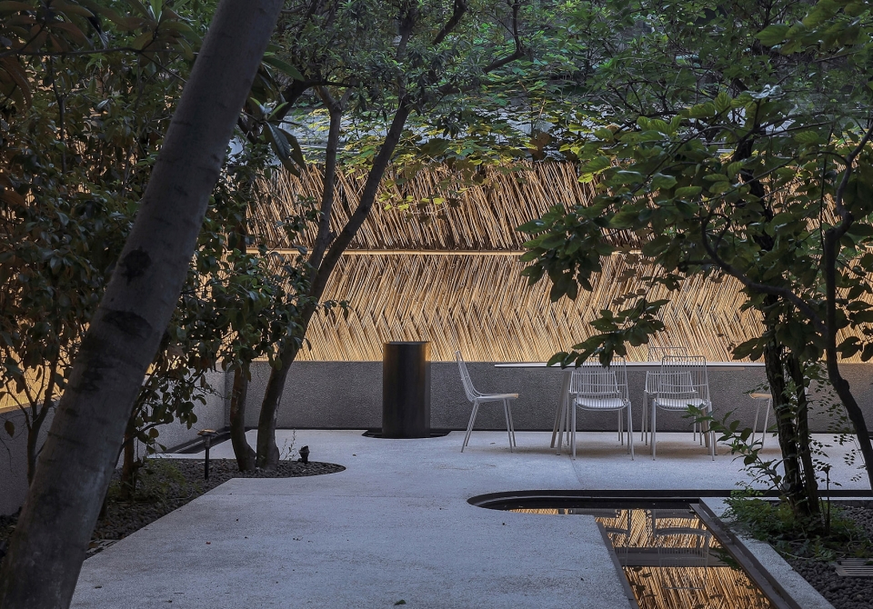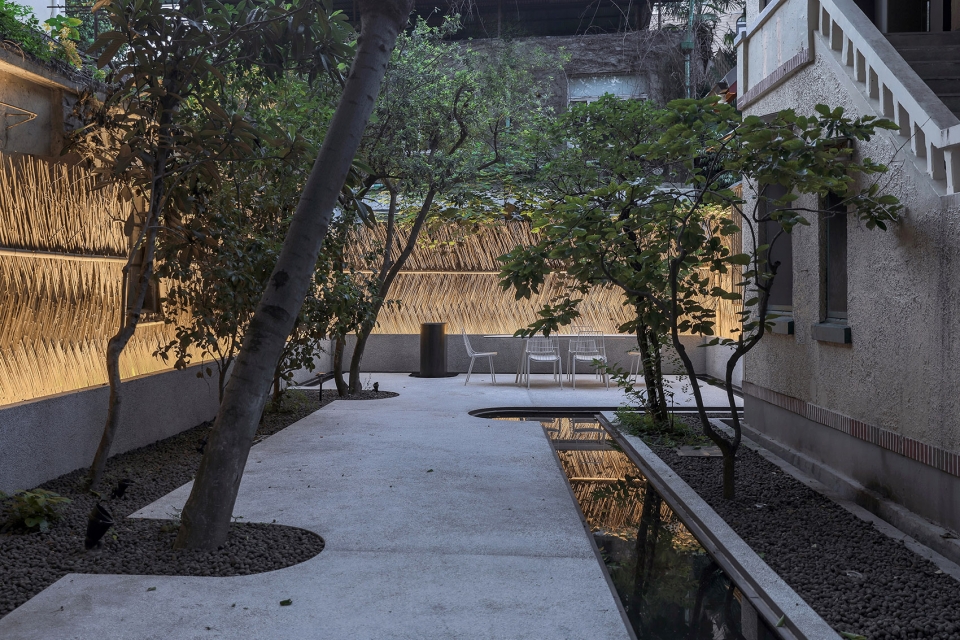 We kept every tree, and set pits for trees according to their location. The floor was made of water-washed stone also. Black pottery grain spread to absorbing water. With the rendering by lighting, each tree becomes a role. The continuation of the form of the ground at the end of the courtyard along with the new topography of ditches, the corner of the arc of the steps of the endless overflow of small pools, is also a response to the new topography. The water in the sink slowly runs through the small yard, and the sound of the gurgling water serves as a counterpoint to the stillness of the yard.