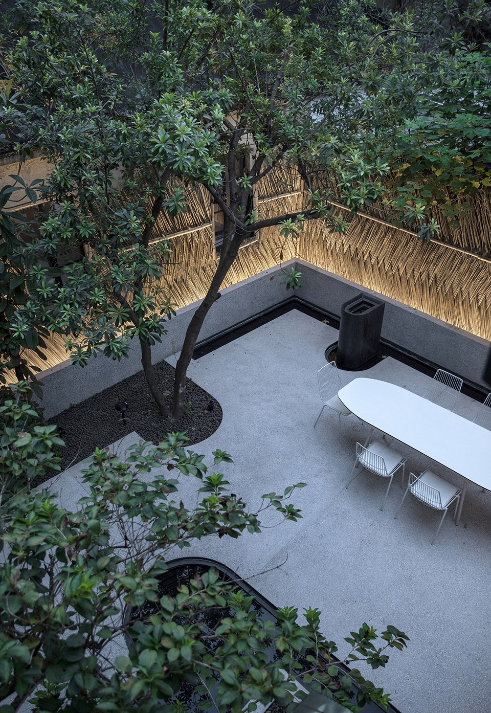 我们保留了每一棵树,并根据其形态预留出相应的树坑位置,采用和矮墙一样的水洗石磨平,用圆弧和直线勾勒新地形,以能快速吸水的黑陶粒满铺,点缀照数投射灯,在这个清逸自然的环境中,佳木秀而繁阴,每一棵树都是主角。庭院尽头延续地面的形式随新地形凿渠,转角处圆弧形的跌阶式无边溢水小池,亦是对新地形的呼应。水池的水缓缓贯穿于整个小庭院,潺潺的细水声更加以衬托庭院的静谧。