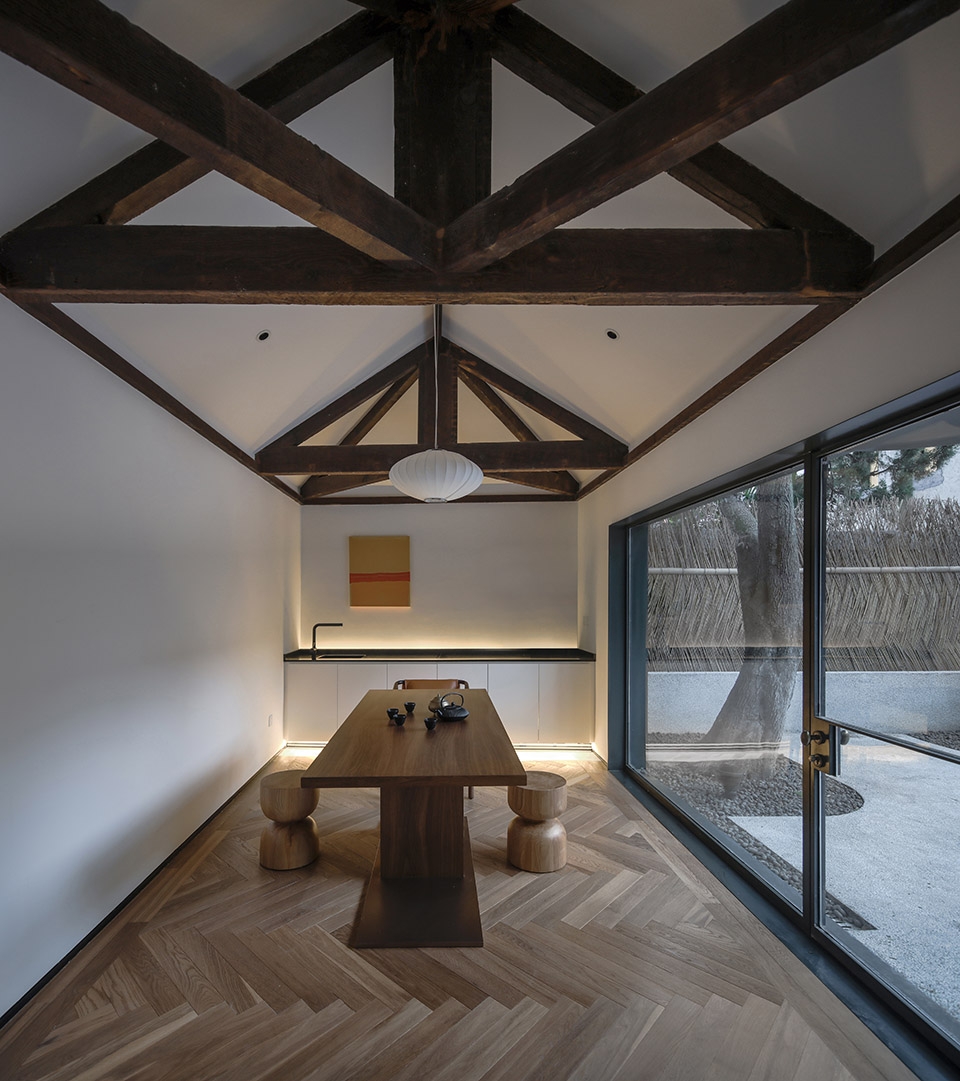We transformed the room into a teahouse and designed large glass flooring to the south of the courtyard, with a panoramic view of the four seasons. The ceiling is removed, the roof is opened up, and the exposed original roof frame wood beams and roof slabs are eaten by termites in large areas. Therefore, before interior decoration, professional organizations carried out the ant elimination project on the wood structure, and reinforce and update some decayed wood structures. The two sets of symmetrical roof beams are exposed, and the sense of space is effectively enhanced. The tea room is equipped with a water bar, and the cabinets upper and lower concealed strip lighting makes the indoor light continue the quiet feeling of the courtyard light.