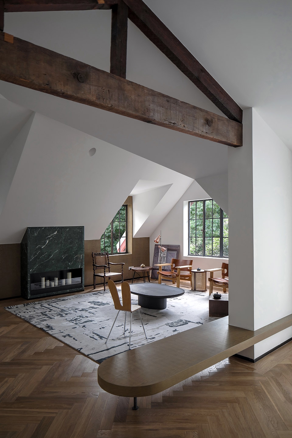 起居室原有的壁炉烟道被重新修复使用,壁炉表面饰以复古哑光的绿色石材。地面进行了整体抬升,并以人字形重新铺设地板,抬升的地面和原地面之间形成的空腔内填隔音绵,降低噪音,楼上楼下互不干扰,充分保证了楼层间的私密性。