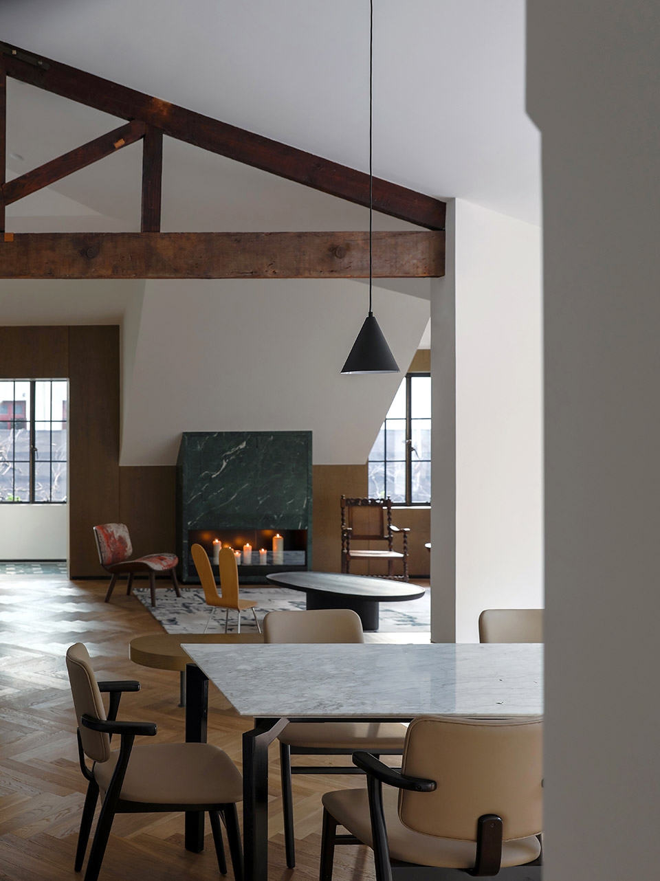 The original chimney flue in the living room has been restored to use, and the fireplace surface is decorated with a green marble with a retro matte finish. The ground has been uplifted and the flooring is re-laid in a herringbone. The cavity formed between the uplifted ground and the original ground is filled with sound insulation, which reduces noise and ensures the privacy of the floor.