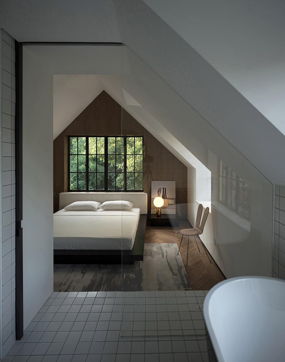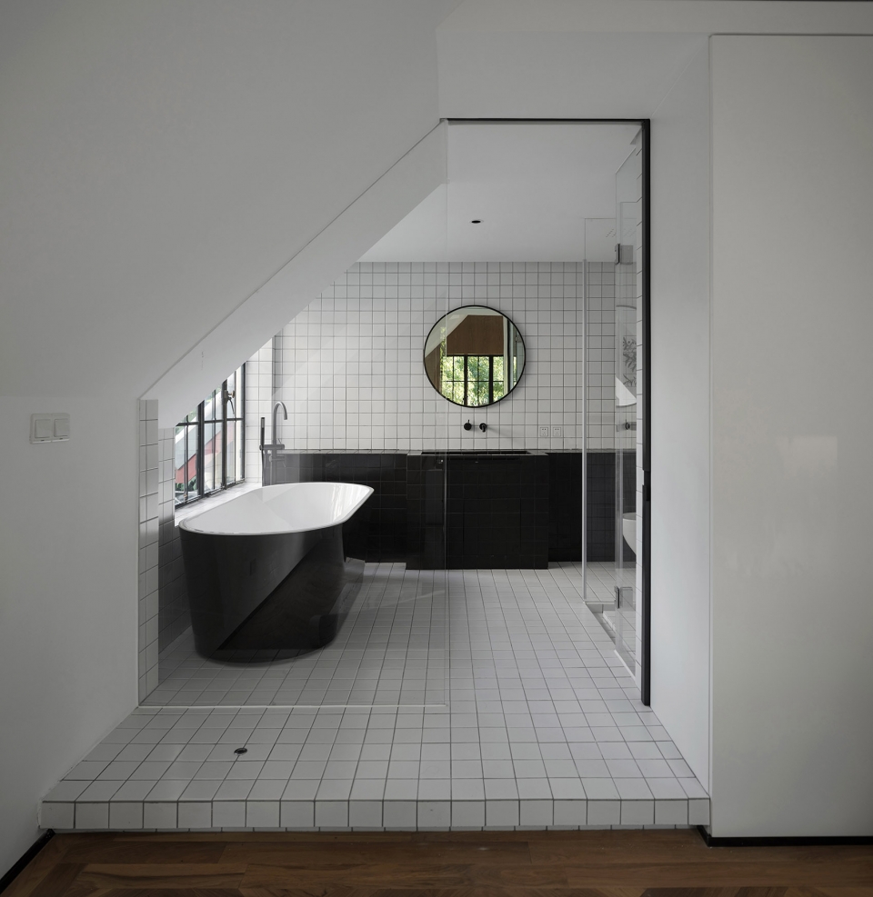 卫生间格局往往是最重要的生活方式的体现,我们对卫生间进行了重新的布局,因原建筑多以木结构为主,卫生间地面是预制混凝土板,重新排列后的卫生间需要解决防水的问题,我们采用造船的构造方法,即把卫生间用钢板进行包裹使得原本上下的排水系统变为同层排水从根本上阻断与楼下邻居的干扰.改造后的两个卫生间干湿分离,分别配备了浴缸.浴缸的开窗均都朝向朝向户外的庭院景观。原本拆除后的门窗五金和把手在这里被重新利用,换下所有的木门窗,并根据德式建筑的特点重新定制了钢窗,配以古铜色天地插销,重现当年的经典样式。