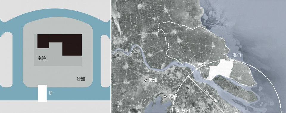 謇里小镇展览馆依水而建,借鉴长江入海口北岸崇启海地区(崇明、海门、启东)特色民居原型“四汀宅沟”:崇启海地区位于长江入海口,地势低洼、积沙成陆,劳动人民从宅地周边挖沟取土,筑高基地,形成环宅沟渠形态;宅沟常设于南侧,若以四周环绕,则被称为“四汀宅沟”。宅沟形态体现了传统农耕文化的智慧:水源可供日常饮用、洗涤、灌溉、消防,又是一道“护宅河”,宅前以小桥为径。时至今日,沙洲地貌已随着现代化建设而变迁,但环宅水系和小桥,仍普遍延续在当地的乡村民居的形态中,是当地风土的宝贵印记。
