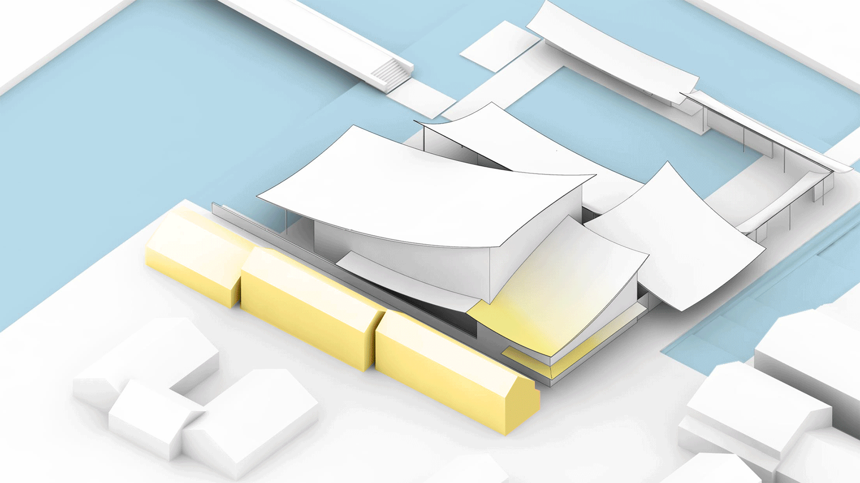 The decentralization and deconstruction strategy endows the architecture with a contemporary spirit, thus creates an iconic cultural image. One whole architecture form is decentralized into four individual venues to minimize the volume contrast between the new art center and the existing wooden construction. The canopy is deconstructed from a traditional roof into four hyperbolic pieces to interpret the tradition with a modern language, with low cornice echoing the scale of the existing construction. Each of it tilts towards the center, reaching a 15-meter-height at the peak to provide adequate vertical spaces for the indoor exhibition area.