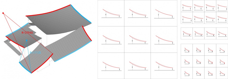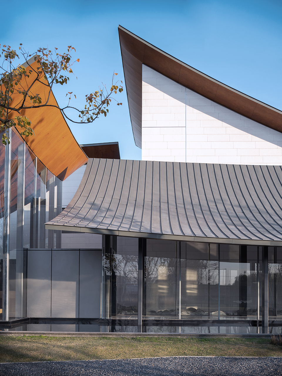 The roofing material is environmentally-friendly titanium-zinc panels. This lightweight roofing material is naturally corrosion-resistant and adapted to the humid subtropical monsoon climate of Haimen. The graphite grey metal with overlapped curved titanium-zinc panels echoes the traditional grey tiles and white walls in the old town buildings. As time goes by, the titanium-zinc panels will form a dense passivation protective layer, lending the building a unique charm. The canopy design applies a hyperboloid numerical logic for efficient construction control. The transverse and longitudinal beams are positive arcs following the same radian and shape. Four hyperbolic canopies use 3D modeling as a design method to control the precise positioning of the spherical construction.
