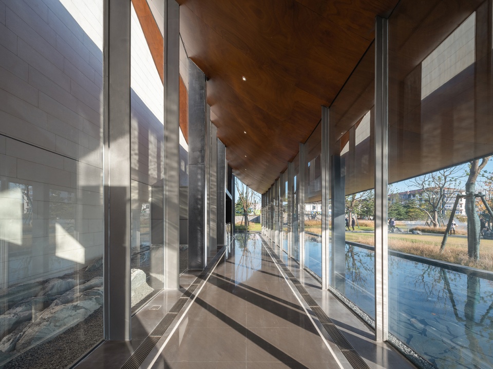 The structure of the roof is designed as a cavity in the shape of an “air pillow” to create a sense of lightness. Each piece of canopy is thick in the middle and thin at the edges. The 500mm thick steel beam structure is hidden inside the structure, with thin cornice, forming a slender and graceful arc at the eave. The natural wood veneer resin ceiling panel is divided into modules in parameterization software. The curved ceiling panel extends from the interior to the exterior, blending the boundary of the open space. When the 15m wide folding door of the exhibition hall is fully opened, the indoor scenarios integrate with outdoor landscapes.