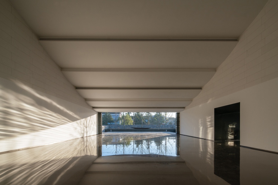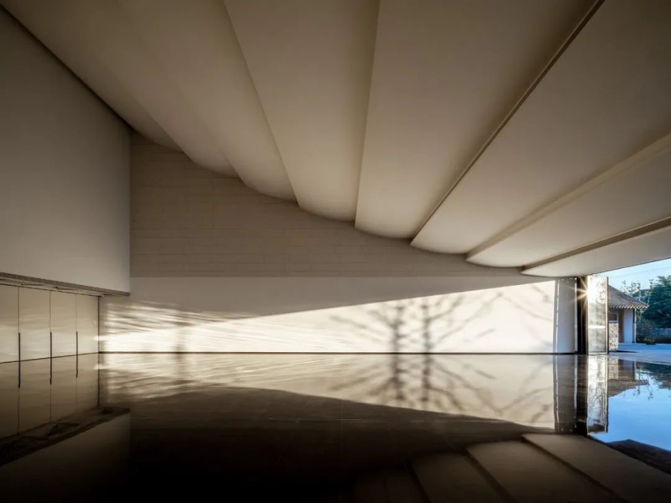 开阔的坡顶从东侧向西侧逐步抬升,展厅内纯净白色天花则呈阶梯状,顺势层层递进,形成强烈的秩序感,结合序列性参观流线,引导人们参观展品。室内的展陈与空间形态完美配合,浑然一体,呈现艺术之美。