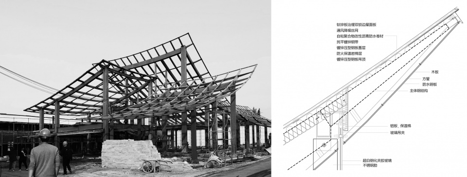 ▼左:屋顶施工现场;右:屋顶构造详图,left: construction site; right: details of roof construction